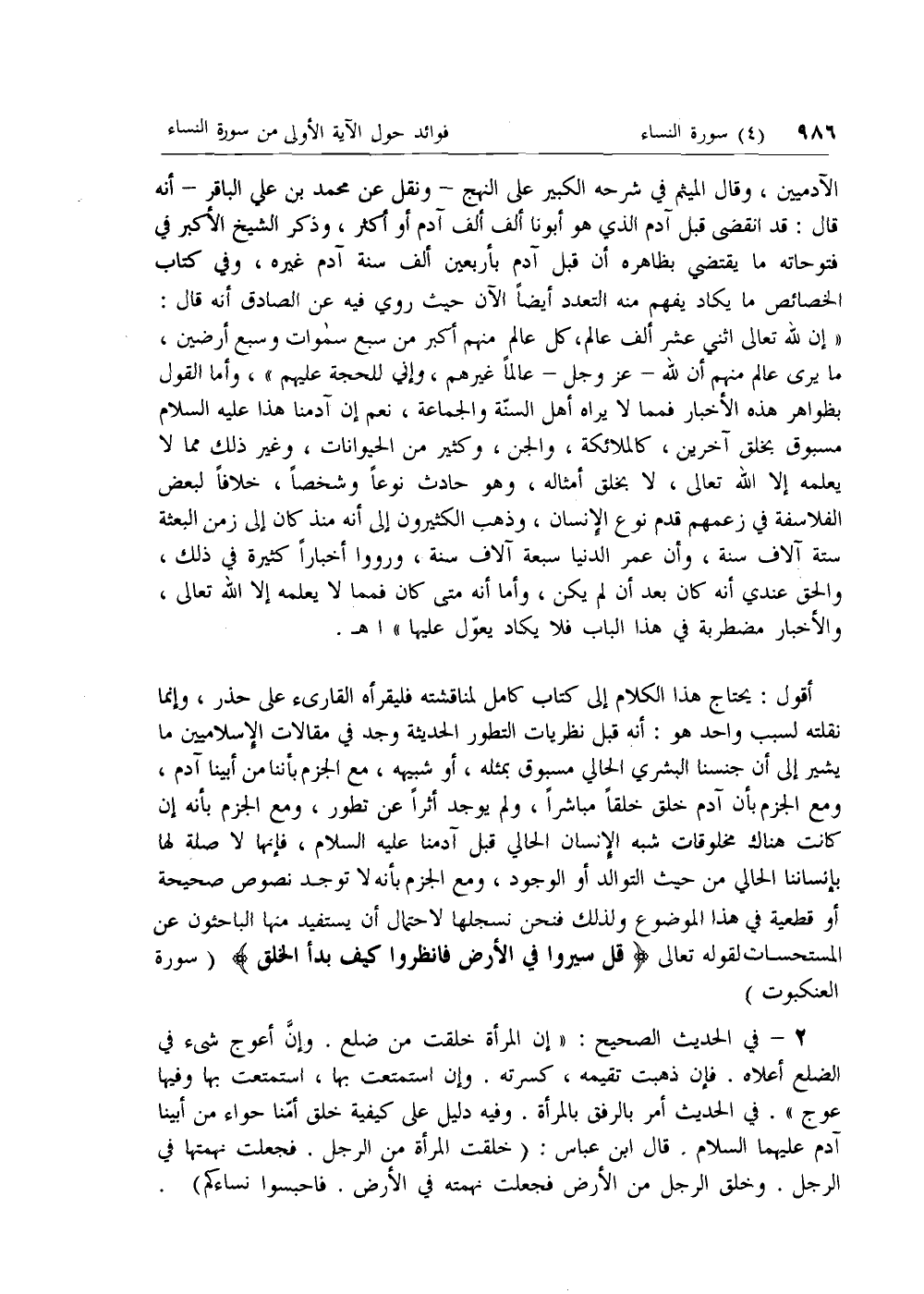 أقول: يحتاج هذا الكلام إلى كتاب كامل لمناقشته فليقرأه القارئ على حذر، وإنما نقلته لسبب واحد هو: أنه قبل نظريات التطور الحديثة وجد في مقالات الإسلاميين ما يشير إلى أن جنسنا البشري الحالي مسبوق بمثله، أو شبيهه، مع الجزم بأننا من أبينا آدم، ومع الجزم بأن آدم خلق خلقا مباشرا، ولم يوجد أثرا عن تطور، ومع الجزم بأنه إن كانت هناك مخلوقات شبه الإنسان الحالي قبل آدمنا عليه السلام، فإنها لا صلة لها بإنساننا الحالي من حيث التوالد أو الوجود، ومع الجزم بأنه لا توجد نصوص صحيحة أو قطعية في هذا الموضوع ولذلك فنحن نسجلها لاحتمال أن يستفيد منها الباحثون عن المستحسات لقوله تعالى قُلْ سِيرُوا فِي الْأَرْضِ فَانْظُرُوا كَيْفَ بَدَأَ الْخَلْقَ (سورة العنكبوت)