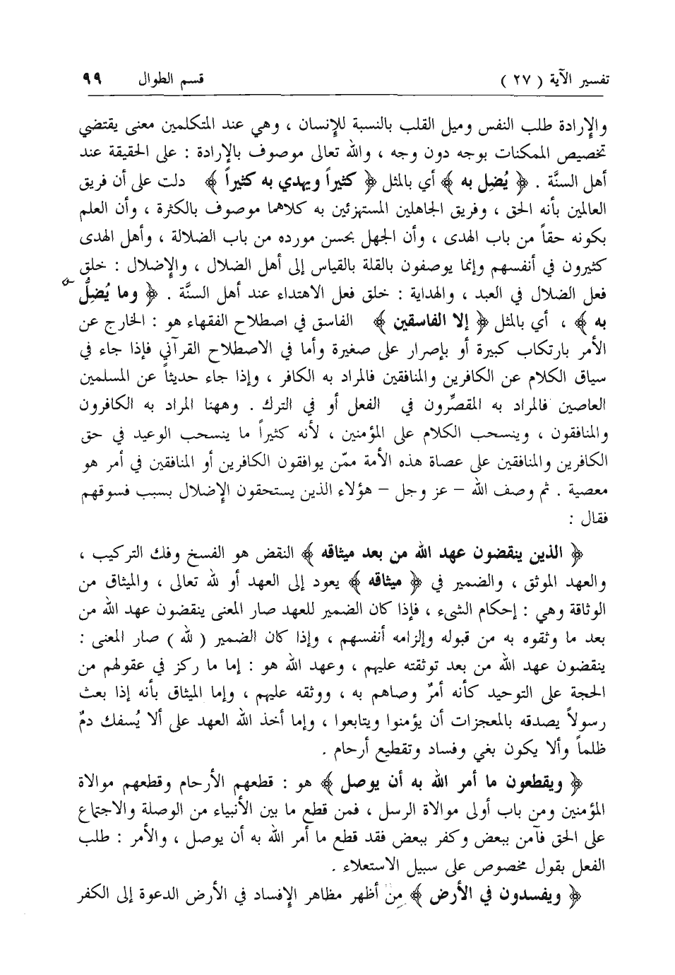 والإرادة طلب النفس وميل القلب بالنسبة للإنسان، وهي عند المتكلمين معنى يقتضي تخصيص الممكنات بوجه دون وجه، والله تعالى موصوف بالإرادة: على الحقيقة عند أهل السنة. يُضِلُّ بِهِ أي بالمثل كَثِيراً وَيَهْدِي بِهِ كَثِيراً دلت على أن فريق العالمين بأنه الحق، وفريق الجاهلين المستهزئين به كلاهما موصوف بالكثرة، وأن العلم بكونه حقا من باب الهدى، وأن الجهل بحسن مورده من باب الضلالة، وأهل الهدى كثيرون في أنفسهم وإنما يوصفون بالقلة بالقياس إلى أهل الضلال، والإضلال: خلق فعل الضلال في العبد، والهداية: خلق فعل الاهتداء عند أهل السنة. وَما يُضِلُّ بِهِ، أي بالمثل إِلَّا الْفاسِقِينَ الفاسق في اصطلاح الفقهاء هو: الخارج عن الأمر بارتكاب كبيرة أو بإصرار على صغيرة وأما في الاصطلاح القرآني فإذا جاء في سياق الكلام عن الكافرين والمنافقين فالمراد به الكافر، وإذا جاء حديثا عن المسلمين العاصين فالمراد به المقصرون في الفعل أو في الترك. وهاهنا المراد به الكافرون والمنافقون، وينسحب الكلام على المؤمنين، لأنه كثيرا ما ينسحب الوعيد في حق الكافرين والمنافقين على عصاة هذه الأمة ممن يوافقون الكافرين أو المنافقين في أمر هو معصية. ثم وصف الله- عزّ وجل- هؤلاء الذين يستحقون الإضلال بسبب فسوقهم فقال: