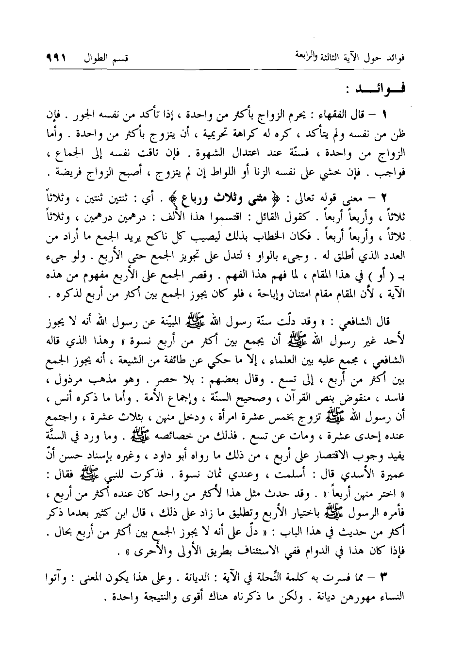 قال الشافعي: «وقد دلت سنة رسول الله صلى الله عليه وسلم المبينة عن رسول الله أنه لا يجوز لأحد غير رسول الله صلى الله عليه وسلم أن يجمع بين أكثر من أربع نسوة» وهذا الذي قاله الشافعي، مجمع عليه بين العلماء، إلا ما حكي عن طائفة من الشيعة، أنه يجوز الجمع بين أكثر من أربع، إلى تسع. وقال بعضهم: بلا حصر. وهو مذهب مرذول، فاسد، منقوض بنص القرآن، وصحيح السنة، وإجماع الأمة. وأما ما ذكره أنس، أن رسول الله صلى الله عليه وسلم تزوج بخمس عشرة امرأة، ودخل منهن، بثلاث عشرة، واجتمع عنده إحدى عشرة، ومات عن تسع. فذلك من خصائصه صلى الله عليه وسلم. وما ورد في السنة يفيد وجوب الاقتصار على أربع، من ذلك ما رواه أبو داود، وغيره بإسناد حسن أن عميرة الأسدي قال: أسلمت، وعندي ثمان نسوة. فذكرت للنبي صلى الله عليه وسلم فقال: