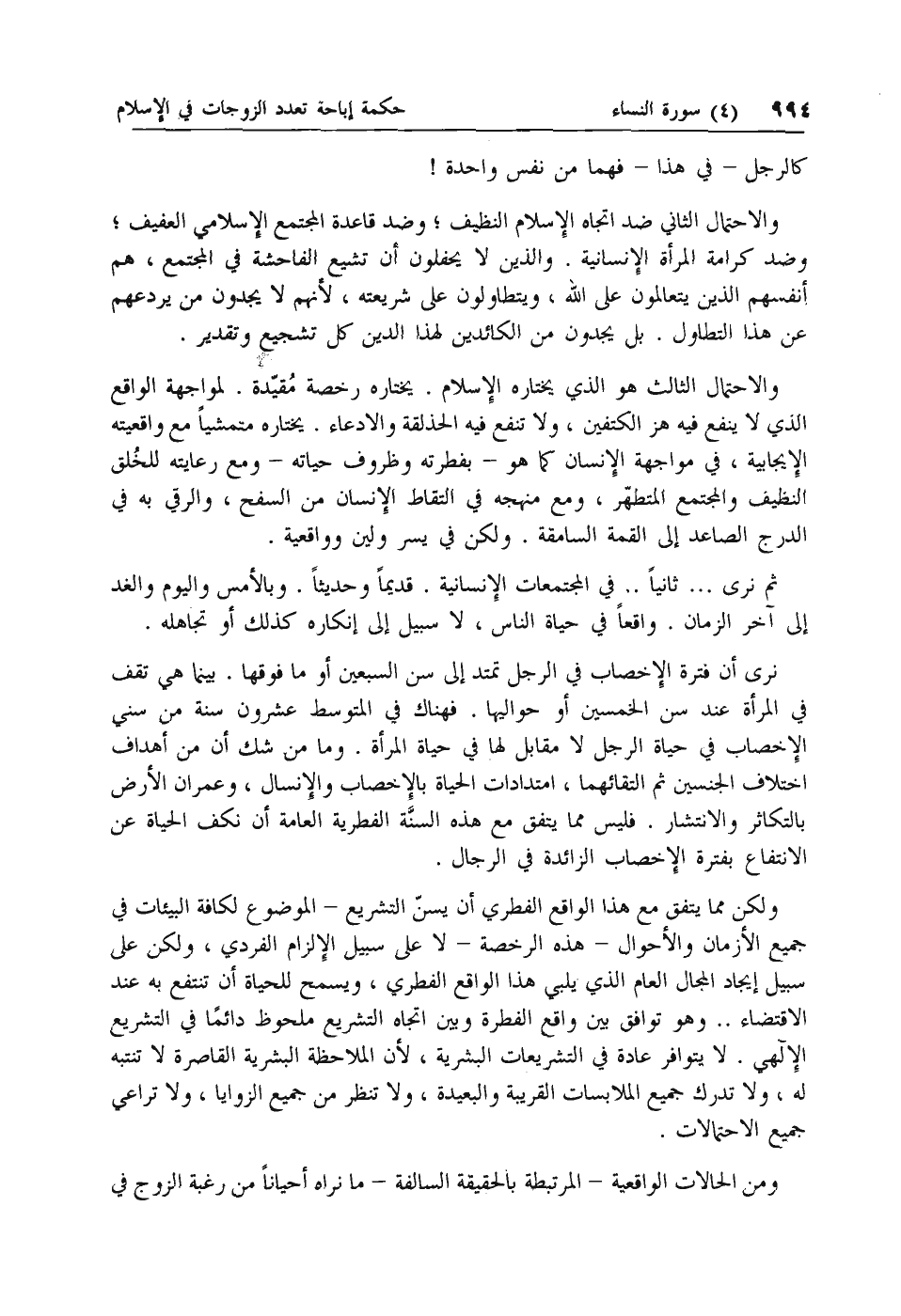 ولكن مما يتفق مع هذا الواقع الفطري أن يسن التشريع- الموضوع لكافة البيئات في جميع الأزمان والأحوال- هذه الرخصة- لا على سبيل الإلزام الفردي، ولكن على سبيل إيجاد المجال العام الذي يلبي هذا الواقع الفطري، ويسمح للحياة أن تنتفع به عند الاقتضاء .. وهو توافق بين واقع الفطرة وبين اتجاه التشريع ملحوظ دائما في التشريع الإلهي. لا يتوافر عادة في التشريعات البشرية، لأن الملاحظة البشرية القاصرة لا تنتبه له، ولا تدرك جميع الملابسات القريبة والبعيدة، ولا تنظر من جميع الزوايا، ولا تراعي جميع الاحتمالات.