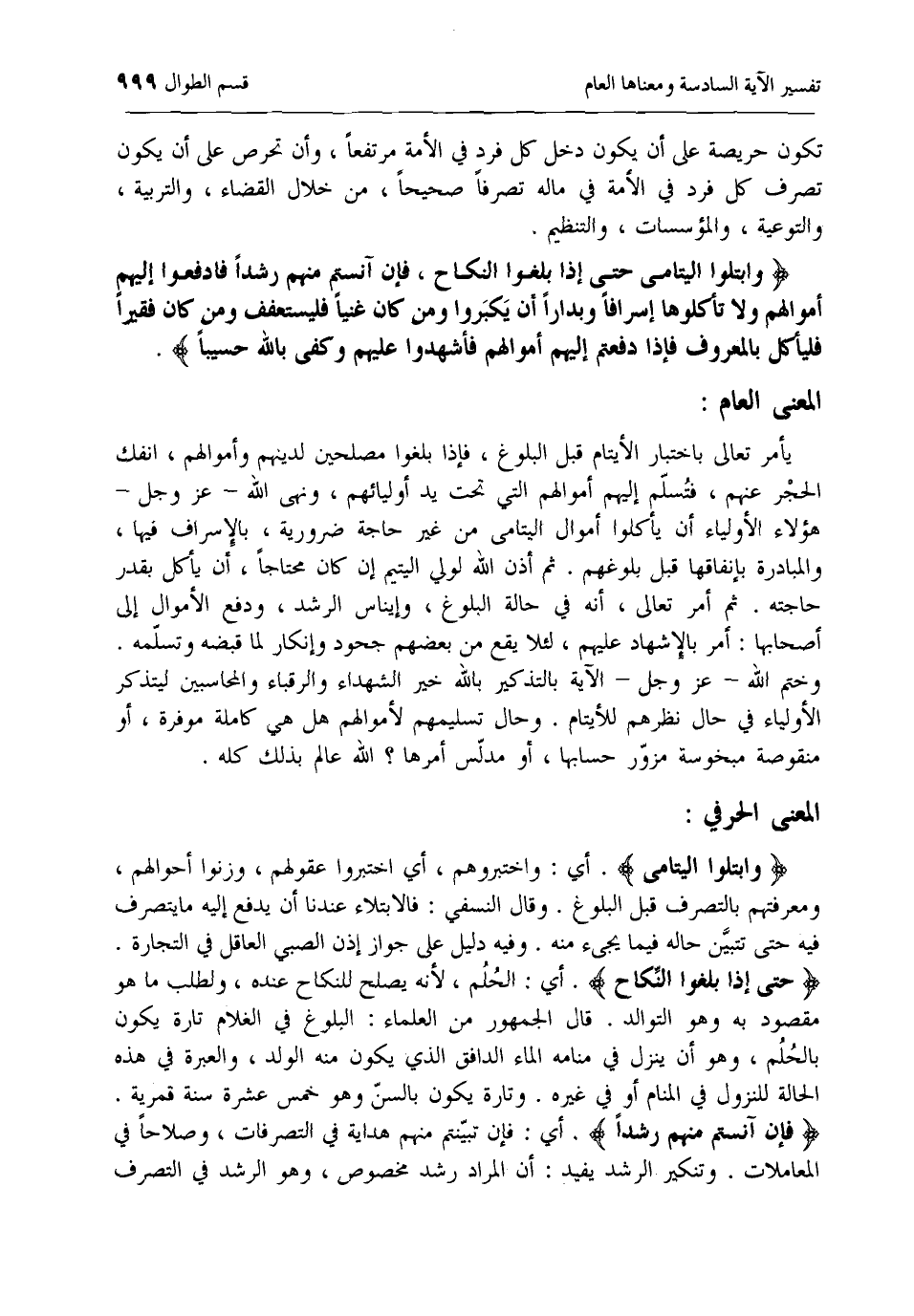 يأمر تعالى باختبار الأيتام قبل البلوغ، فإذا بلغوا مصلحين لدينهم وأموالهم، انفك الحجر عنهم، فتسلم إليهم أموالهم التي تحت يد أوليائهم، ونهى الله- عزّ وجل- هؤلاء الأولياء أن يأكلوا أموال اليتامى من غير حاجة ضرورية، بالإسراف فيها، والمبادرة بإنفاقها قبل بلوغهم. ثم أذن الله لولي اليتيم إن كان محتاجا، أن يأكل بقدر حاجته. ثم أمر تعالى، أنه في حالة البلوغ، وإيناس الرشد، ودفع الأموال إلى أصحابها: أمر بالإشهاد عليهم، لئلا يقع من بعضهم جحود وإنكار لما قبضه وتسلمه.