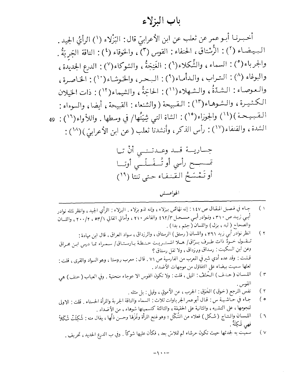 أخبرنَا أَبُو عمر عَن ثَعْلَب عَن ابْن الْأَعرَابِي قَالَ البزلاء الرَّأْي الْجيد الْبَيْضَاء الرستاق الحنفاء الْقوس والخوقاء النَّاقة الجربة والجرباء السَّمَاء والشكلاء الغنجة والشوكاء الدرْع الجديدة والبوغاء التُّرَاب والدأماء الْبَحْر والخوشاء الخاصرة والعوصاء الشدَّة والشهلاء الْحَاجة والشيماء ذَات الخيلان الْكَثِيرَة والشوهاء القبيحة والشنعاء القبيحة أَيْضا والسوءاء القبيحة والجوزاء الشَّاة الَّتِي شيتها فِي وَسطهَا واللأواء الشدَّة والقنفاء رَأس الذّكر وأنشدنا ثَعْلَب عَن ابْن الْأَعرَابِي