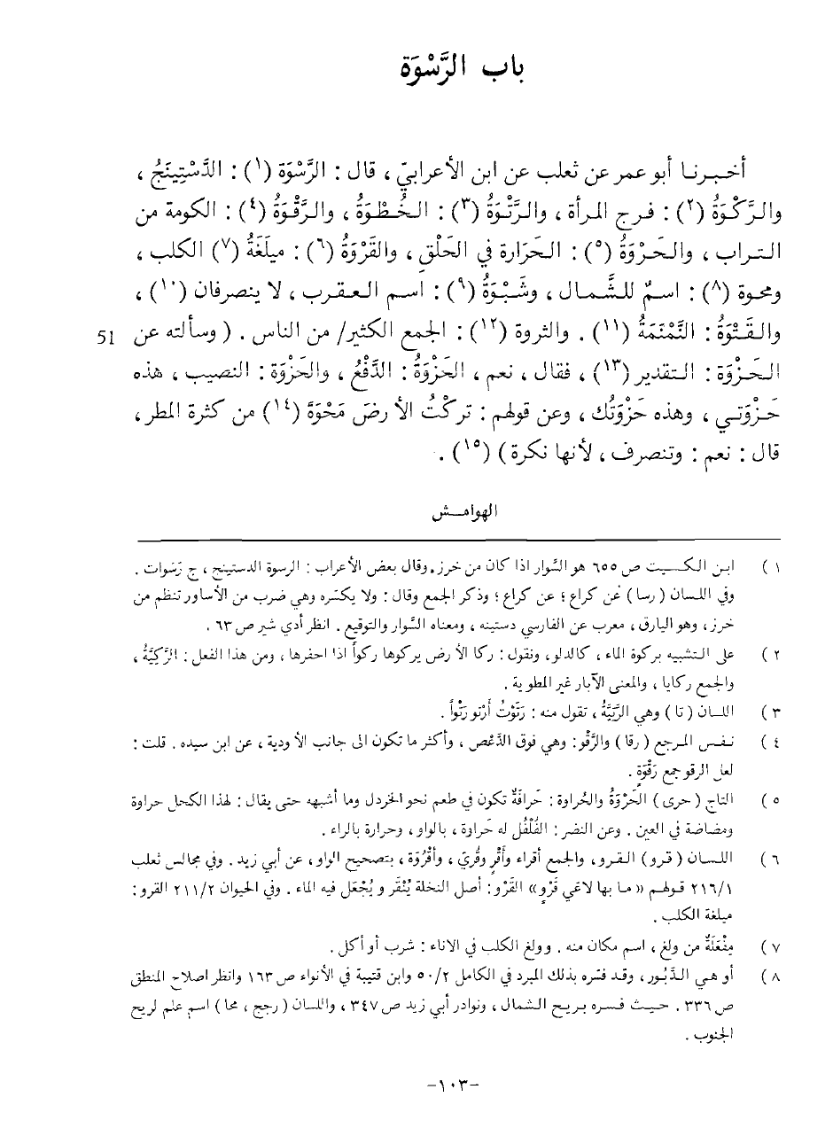 أخبرنَا أَبُو عمر عَن ثَعْلَب عَن ابْن الْأَعرَابِي قَالَ الرسوة الدستينج والركوة فرج الْمَرْأَة والرتوة الخطوة والرقوة الكومة من التُّرَاب والحروة الْحَرَارَة فِي الْحلق والقروة ميلغة الْكَلْب ومحوة اسْم للشمال وشبوة اسْم الْعَقْرَب لَا ينصرفان والقتوة النمنمة والثروة الْجمع الْكثير من النَّاس وَسَأَلته عَن الحزوة التَّقْدِير فَقَالَ نعم الحزوة الدّفع والحزوة النَّصِيب هَذِه حزوتي وَهَذِه حزوتك وَعَن قَوْلهم تركت الأَرْض محوة من كَثْرَة الْمَطَر قَالَ نعم وتنصرف لِأَنَّهَا نكرَة