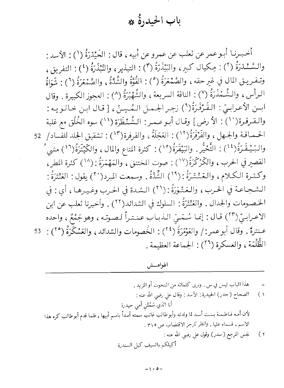أخبرنَا أَبُو عمر عَن ثَعْلَب عَن عَمْرو عَن أَبِيه قَالَ الحيدرة الْأسد والسندرة مكيال كَبِير والبيذرة التبذير والنبذرة التَّفْرِيق وتفريق المَال فِي غير حَقه والصمعرة الْقُوَّة والشدة والصمعرة شواة الرَّأْس والشمذرة النَّاقة السريعة والشهبرة الْعَجُوز الْكَبِيرَة وَقَالَ ابْن الْأَعرَابِي القرقرة زجر الْجمل المسن قَالَ ابْن خالويه والقرقرة الأَرْض وَقَالَ أَبُو عمر الشنظرة سوء الْخلق مَعَ غَلَبَة الحماقة وَالْجهل والفرفرة العجلة والفرفرة تشقيق الْجلد للْفَسَاد والبيقرة التحير والبيقرة كَثْرَة الْمَتَاع وَالْمَال والكيثرة مشي الْقصير فِي الْحَرْب والكركرة صَوت المختنق والمهمرة كَثْرَة الْمَطَر وَكَثْرَة الْكَلَام والعنترة الشدَّة وَسمعت الْمبرد يَقُول العنترة الشجَاعَة فِي الْحَرْب والعتورة الشدَّة فِي الْحَرْب وَغَيرهَا أَي فِي الْخُصُومَات والجدال والعنترة السلوك فِي الشدائد وَأخْبرنَا ثَعْلَب عَن ابْن الْأَعرَابِي قَالَ إِنَّمَا سمي الذُّبَاب عنترا لصوته وَهُوَ جمع واحده عنترة وَقَالَ أَبُو عمر والعومرة الْخُصُومَات والشدائد والعسكرة الظلمَة والعسكرة الْجَمَاعَة الْعَظِيمَة