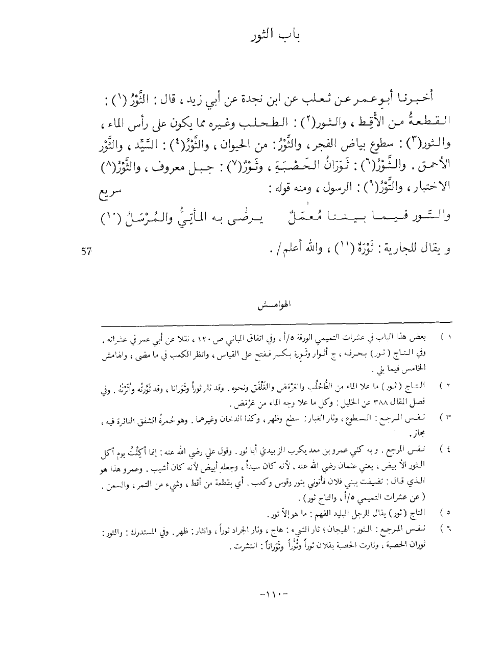 أخبرنَا أَبُو عمر عَن ثَعْلَب عَن ابْن نجدة عَن أبي زيد قَالَ الثور الْقطعَة من الأقط والثور الطحلب وَغَيره مِمَّا يكون على رَأس المَاء والثور سطوع بَيَاض الْفجْر والثور من الْحَيَوَان والثور السَّيِّد والثور الأحمق والثور ثوران الحصبة وثور جبل مَعْرُوف والثور الاختبار والتور الرَّسُول صلى الله عَلَيْهِ وَسلم وَمِنْه قَوْله