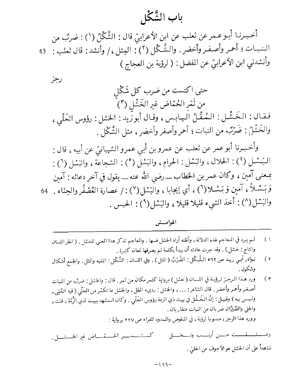 أخبرنَا ابو عمر عَن ثَعْلَب عَن ابْن الْأَعرَابِي قَالَ الشكل ضرب من النَّبَات أَحْمَر وأصفر وأخضر والشكل الْمثل وانشد قَالَ ثَعْلَب وأنشدني ابْن الْأَعرَابِي عَن الْمفضل لرؤبة بن العجاج رجز