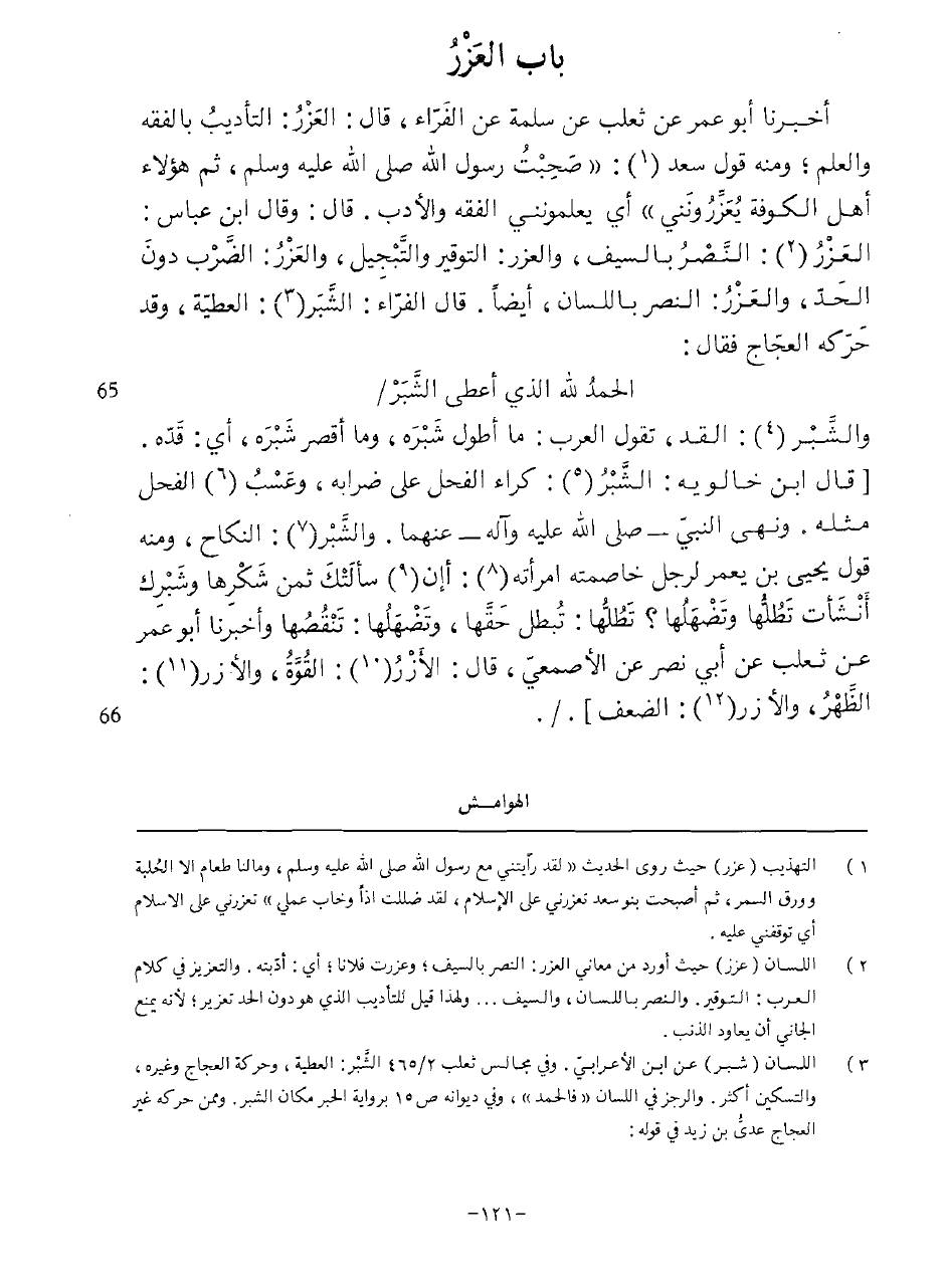 أخبرنَا أَبُو عمر عَن ثَعْلَب عَن سَلمَة عَن الْفراء قَالَ العزر التَّأْدِيب بالفقه وَالْعلم وَمِنْه قَول سعد صَحِبت رَسُول الله صلى الله عَلَيْهِ وَسلم ثمَّ هَؤُلَاءِ أهل الْكُوفَة يعزرونني أَي يعلمونني الْفِقْه وَالْأَدب قَالَ وَقَالَ ابْن عَبَّاس العزر النَّصْر بِالسَّيْفِ والعزر التوقير والتبجيل والعزر الضَّرْب دون الْحَد والعزر النَّصْر بِاللِّسَانِ أَيْضا قَالَ الْفراء الشبر الْعَطِيَّة وَقد حَرَكَة العجاج فَقَالَ