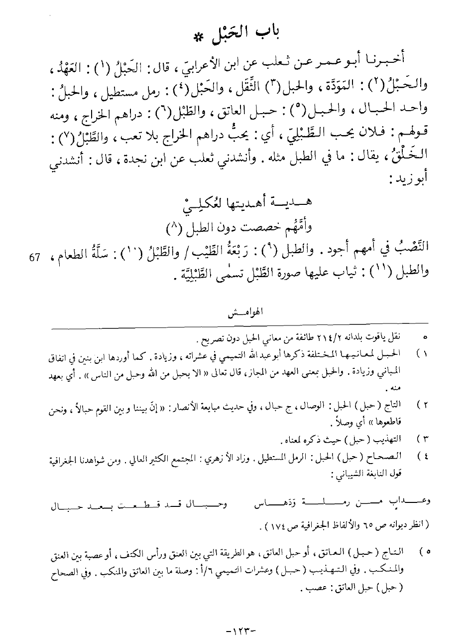 أخبرنَا ابو عمر عَن ثَعْلَب عَن ابْن الْأَعرَابِي قَالَ الْحَبل الْعَهْد وَالْحَبل الْمَوَدَّة وَالْحَبل الثّقل وَالْحَبل رمل مستطيل وَالْحَبل وَاحِد الحبال حَبل العاتق والطبل دَرَاهِم الْخراج وَمِنْه قَوْلهم فلَان يحب الطبلي أَي يحب دَرَاهِم الْخراج بِلَا تَعب والطبل الْخلق يُقَال مَا فِي الطبل مثله وأنشدني ثَعْلَب عَن ابْن نجدة قَالَ أَنْشدني أَبُو زيد