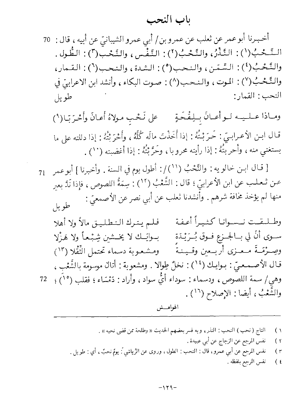 أخبرنَا أَبُو عمر عَن ثَعْلَب عَن عَمْرو بن أبي عَمْرو الشَّيْبَانِيّ عَن أَبِيه قَالَ النحب النّذر والنحب النَّفس والنحب الطول والنحب السّمن والنحب الشدَّة والنحب الْقمَار والنحب الْمَوْت والنحب صَوت الْبكاء وَأنْشد ابْن الْأَعرَابِي فِي النحب الْقمَار طَوِيل
