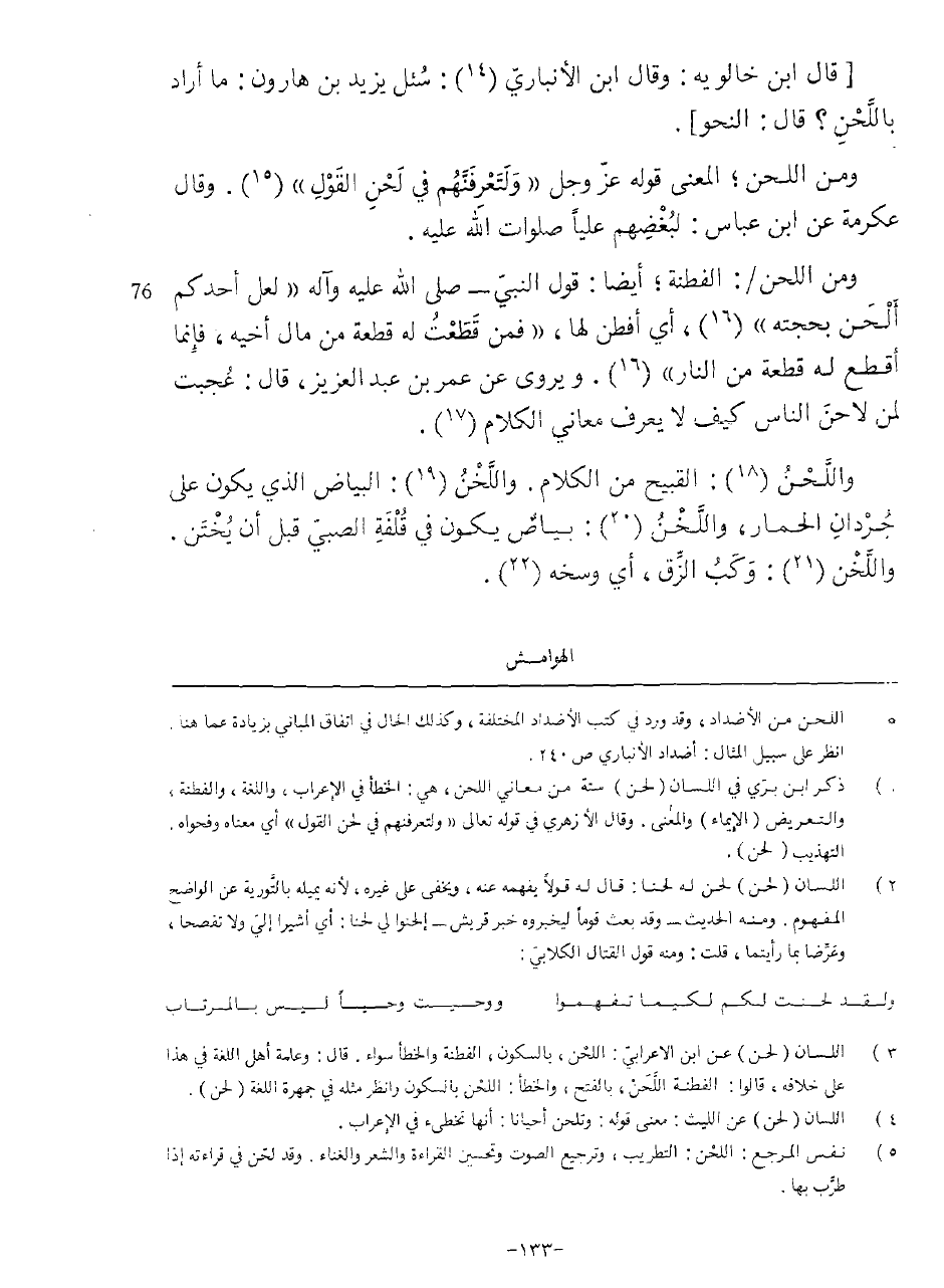 قَالَ ابْن خالويه وَقَالَ ابْن الْأَنْبَارِي سُئِلَ يزِيد بن هَارُون مَا أَرَادَ باللحن قَالَ النَّحْو