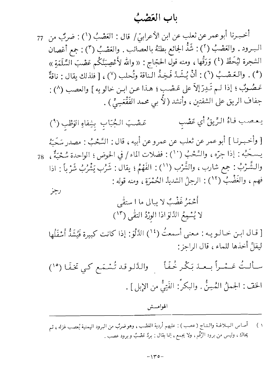 أخبرنَا ابو عمر عَن ثَعْلَب عَن ابْن الْأَعرَابِي قَالَ العصب ضرب من البرود والعصب شدّ الجائع بَطْنه بالعصائب والعصب جمع أَغْصَان الشَّجَرَة ليحط وَرقهَا وَمِنْه قَول الْحجَّاج وَالله لأعصبنكم عصب السلمة والعصب أَن يشد فَخذ النَّاقة وتحلب فَلذَلِك يُقَال نَاقَة عصوب إِذا لم تدر إِلَّا على عصب هَذَا عَن ابْن خالويه والعصب جفاف الرِّيق على الشفتين وَأنْشد لأبي مُحَمَّد الفقعسي