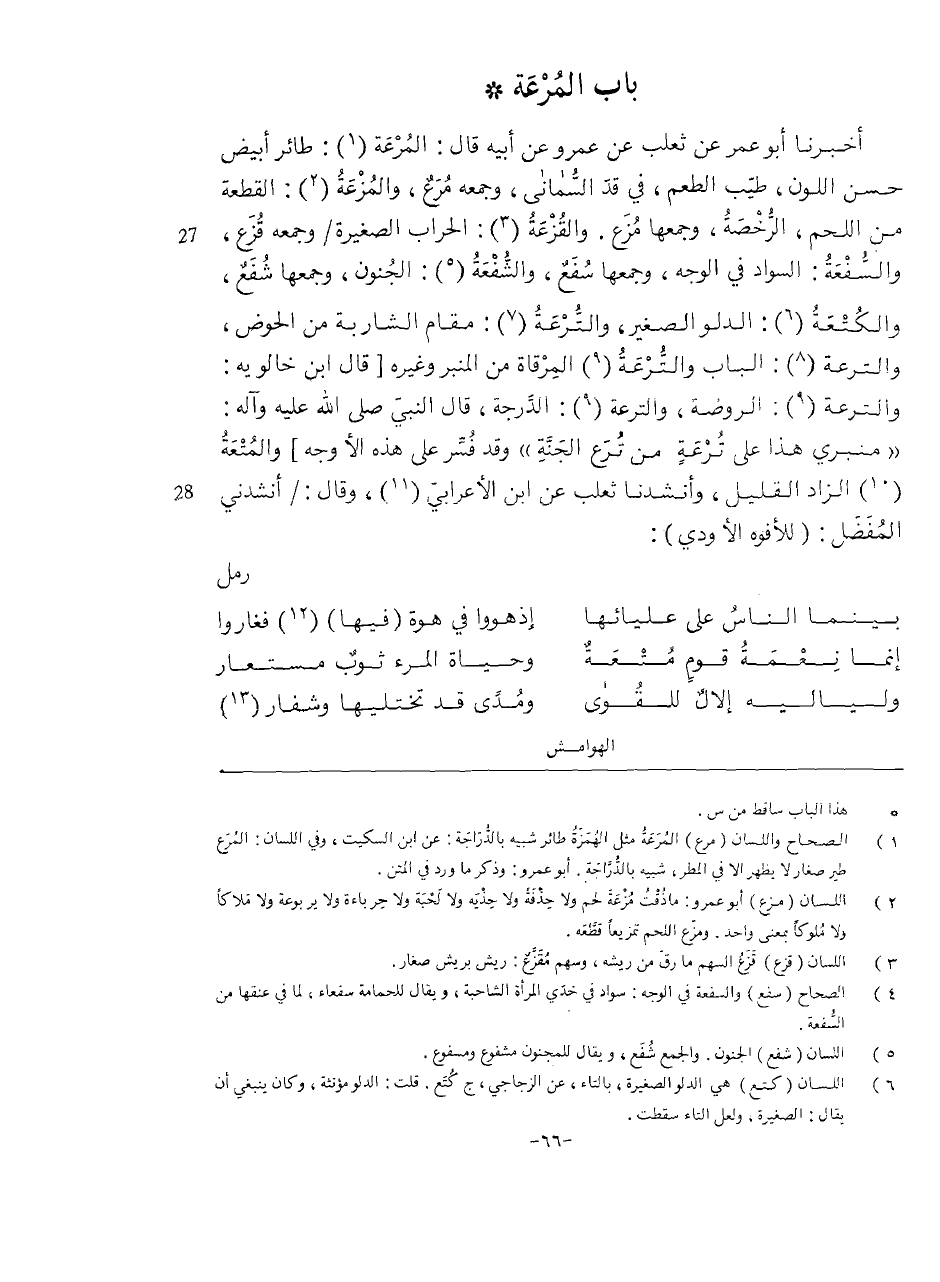 أخبرنَا أَبُو عمر عَن ثَعْلَب عَن عَمْرو عَن أَبِيه قَالَ المرعة طَائِر أَبيض حسن اللَّوْن طيب الطّعْم فِي قد السمانى وَجمعه مرع والمزعة الْقطعَة من اللَّحْم الرُّخْصَة وَجَمعهَا مزع والقزعة الحراب الصَّغِيرَة وَجمعه قزع والسفعة السوَاد فِي الْوَجْه وَجَمعهَا سفع وَالشُّفْعَة الْجُنُون وَجَمعهَا شفع والكتعة الدَّلْو الصَّغِير والترعة مقَام الشاربة من الْحَوْض والترعة الْبَاب والترعة الْمرقاة من الْمِنْبَر وَغَيره قَالَ ابْن خالويه والترعة الرَّوْضَة والترعة الدرجَة قَالَ النَّبِي صلى الله عَلَيْهِ وَسلم منبري هَذَا على ترعة من ترع الْجنَّة وَقد فسر على هَذِه الْأَوْجه والمتعة الزَّاد الْقَلِيل وأنشدنا ثَعْلَب عَن ابْن الْأَعرَابِي وَقَالَ أَنْشدني الْمفضل للأفوه الأودي