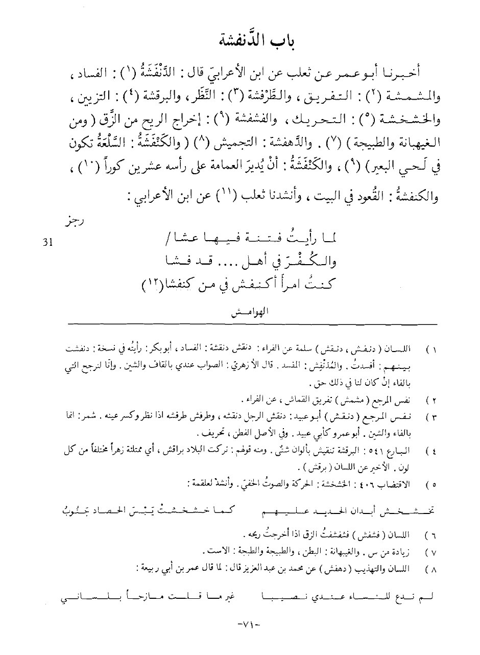أخبرنَا أَبُو عمر عَن ثَعْلَب عَن ابْن الْأَعرَابِي قَالَ الدنفشة الْفساد والمشمشة التَّفْرِيق والطرفشة النّظر والبرقشة التزيين والخشخشة التحريك والفشفشة إِخْرَاج الرّيح من الزق وَمن الغيهبانة والطبيجة والدهفشة التجميش والكنفشة السّلْعَة تكون فِي لحي الْبَعِير والكنفشة أَن يُدِير الْعِمَامَة على رَأسه عشْرين كورا والكنفشة الْقعُود فِي الْبَيْت وأنشدنا ثَعْلَب عَن ابْن الْأَعرَابِي رجز