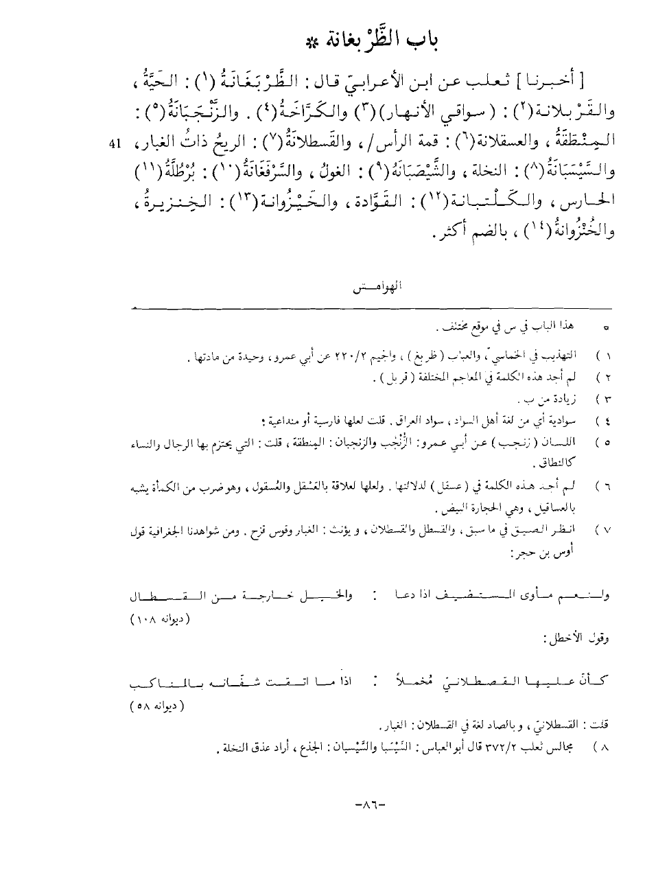 أخبرنَا ثَعْلَب عَن ابْن الْأَعرَابِي قَالَ الطربغانة الْحَيَّة والقربلانة سواقي الْأَنْهَار والكراخة والزنجبانة المنطقة والعسقلانة قمة الرَّأْس والقسطلانة الرّيح ذَات الْغُبَار والسيسبانة النَّخْلَة والشيصبانة الغول والسرفغانة برطلة الحارس والكلتبانة القوادة والخيزوانة الخنزيرة والخنزوانة بِالضَّمِّ أَكثر