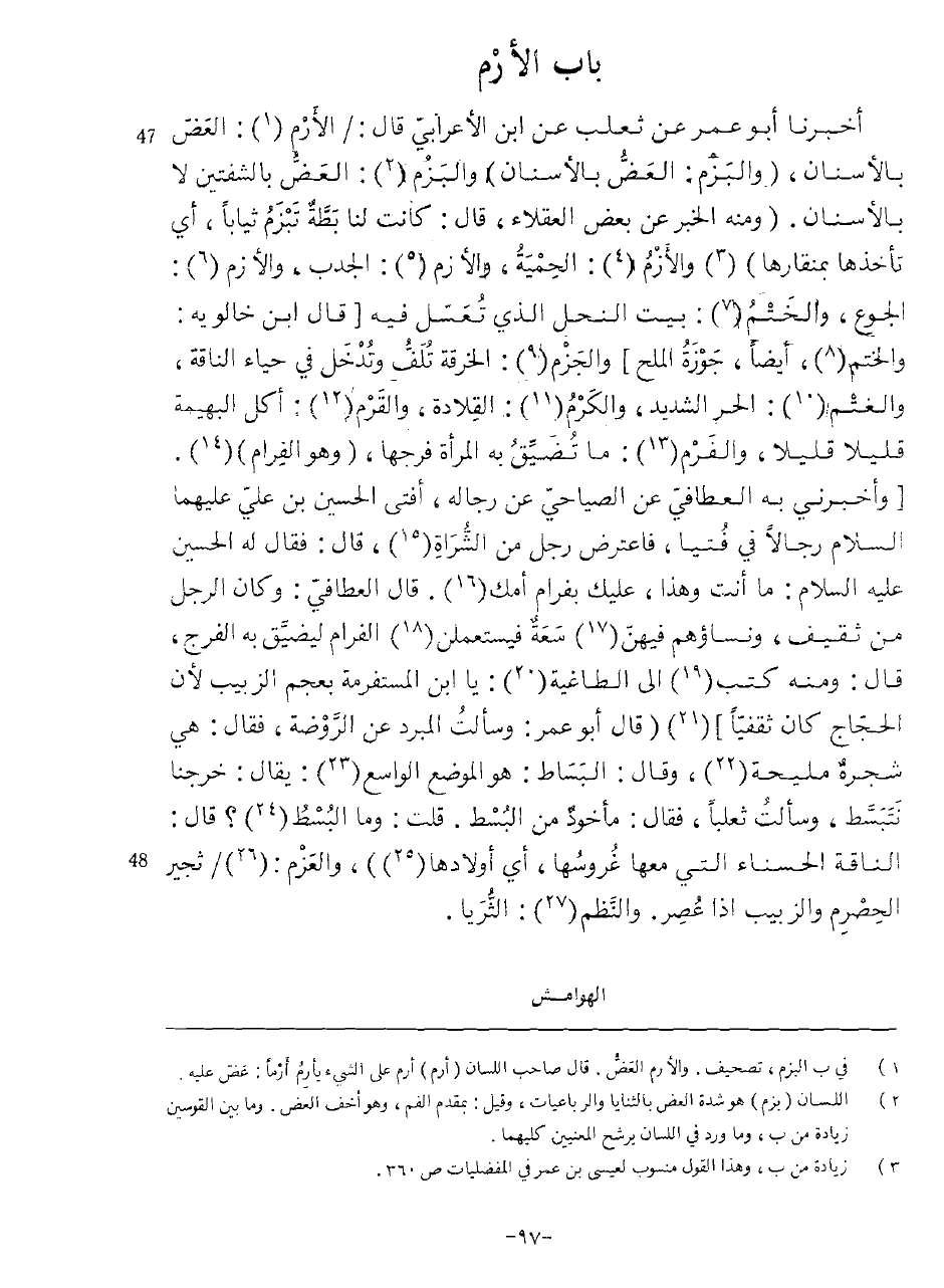 أخبرنَا أَبُو عمر عَن ثَعْلَب عَن ابْن الْأَعرَابِي قَالَ الأرم العض بالأسنان والبزم العض بالأسنان والبزم العض بالشفتين لَا بالأسنان وَمِنْه الْخَبَر عَن بعض الْعُقَلَاء قَالَ كَانَت لنا بطة تبزم ثيابًا أَي تأخذها بمنقارها والأزم الحمية والأزم الجدب والأزم الْجُوع والختم بَيت النَّحْل الَّذِي تعسل فِيهِ قَالَ ابْن خالويه والختم ايضا جوزة الْملح والجزم الْخِرْقَة تلف وَتدْخل فِي حَيَاء النَّاقة والغتم الْحر الشَّديد وَالْكَرم القلادة وَالْقَرْمُ أكل الْبَهِيمَة قَلِيلا قَلِيلا والفرم مَا تضيق بِهِ الْمَرْأَة فرجهَا وَهُوَ الفرام وَأَخْبرنِي بِهِ العطافي عَن الصياحي عَن رِجَاله أفتى الْحُسَيْن بن عَليّ عَلَيْهِمَا السَّلَام رجَالًا فِي فتيا فَاعْترضَ رجل من الشراة قَالَ فَقَالَ لَهُ الْحُسَيْن عَلَيْهِ السَّلَام مَا أَنْت وَهَذَا عَلَيْك بفرام أمك قَالَ العطافي وَكَانَ الرجل من ثَقِيف وَنِسَاؤُهُمْ فِيهِنَّ سَعَة فيستعملن الفرام ليضيق بِهِ الْفرج قَالَ وَمِنْه كتب إِلَى الطاغية يَا ابْن المستفرمة بعجم الزَّبِيب لِأَن الْحجَّاج كَانَ ثقفيا قَالَ أَبُو عمر وَسَأَلت الْمبرد عَن الرَّوْضَة فَقَالَ هِيَ شَجَرَة مليحة وَقَالَ الْبسَاط هُوَ الْموضع الْوَاسِع يُقَال خرجنَا نتبسط وَسَأَلت ثعلبا فَقَالَ مَأْخُوذ من الْبسط قلت وَمَا الْبسط قَالَ النَّاقة الْحَسْنَاء الَّتِي مَعهَا غروسها أَي أَوْلَادهَا والعزم ثجير الحصرم وَالزَّبِيب إِذا عصر وَالنّظم الثريا