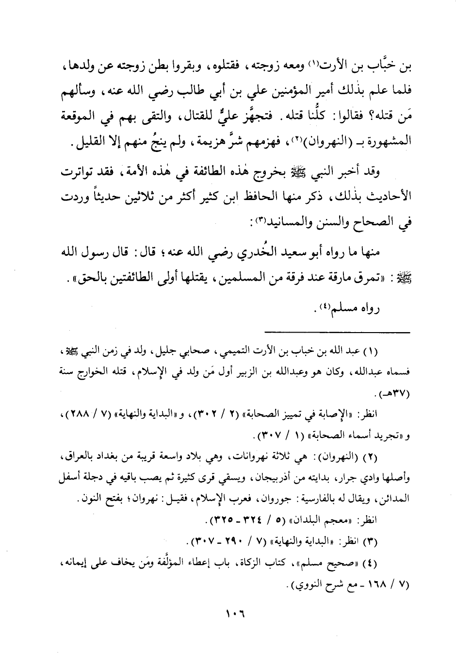 بن خبَّاب بن الأرت (¬١) ومعه زوجته، فقتلوه، وبقروا بطن زوجته عن ولدها، فلما علم بذلك أمير المؤمنين علي بن أبي طالب رضي الله عنه، وسألهم مَنْ قتله؟ فقالوا: كلُّنا قتله. فتجهَّز علىٌّ للقتال، والتقى بهم في الموقعة المشهورة بـ (النهروان) (¬٢)، فهزمهم شرَّ هزيمة، ولم ينجُ منهم إِلَّا القليل.