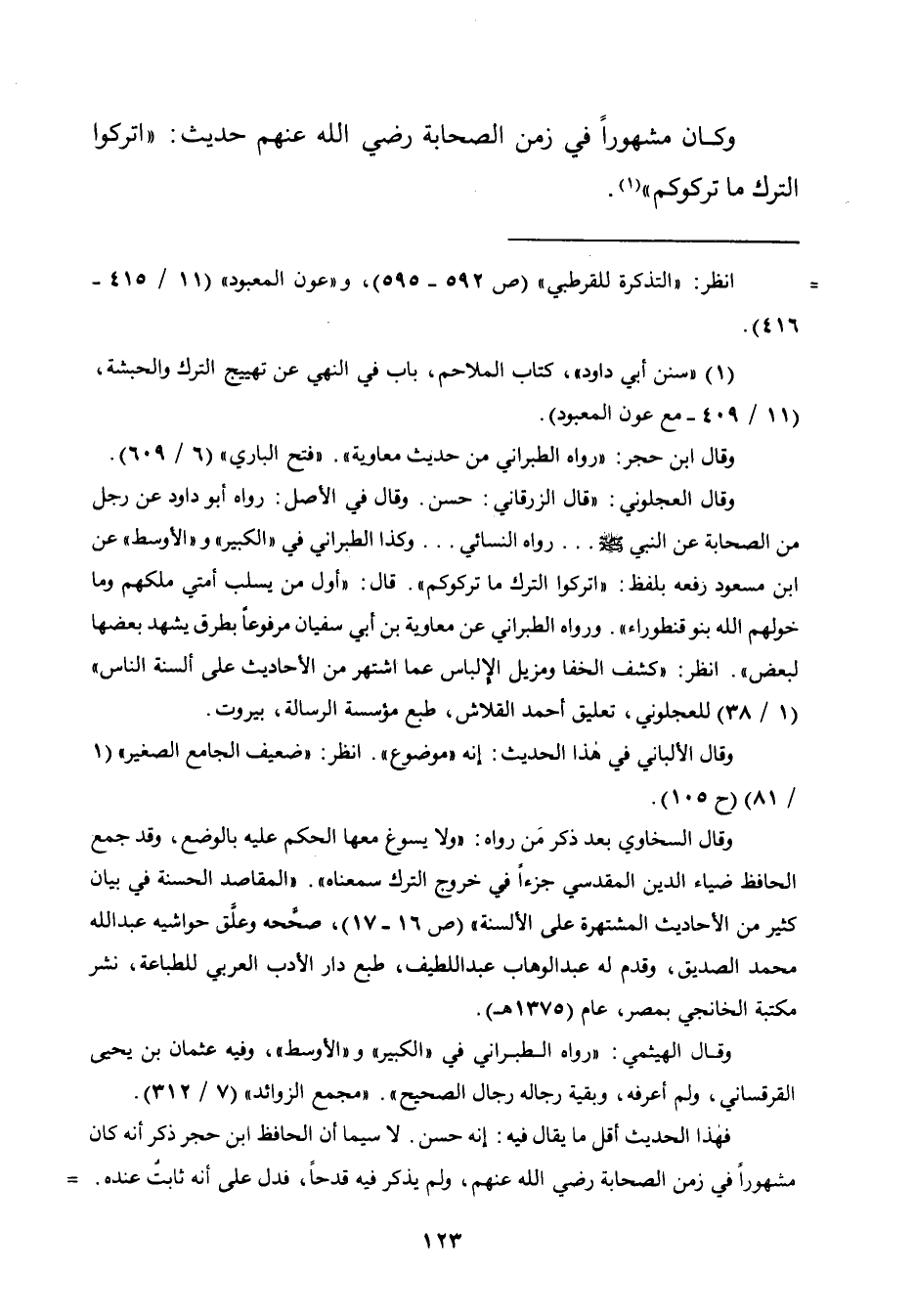 وقال العجلوني: "قال الزرقاني: حسن. وقال في الأصل: رواه أبو داود عن رجل من الصّحابة عن النّبيّ - صلّى الله عليه وسلم - ... رواه النسائي ... وكذا الطبراني في "الكبير" و "الأوسط" عن ابن مسعود رفعه بلفظ: "اتركوا الترك ما تركوكم". قال: "أول من يسلب أمتي ملكهم وما خولهم الله بنو قنطوراء". ورواه الطبراني عن معاوية بن أبي سفيان مرفوعًا بطرق يشهد بعضها لبعض". انظر: "كشف الخفا ومزيل الإِلباس عما اشتهر من الأحاديث على ألسنة النَّاس"