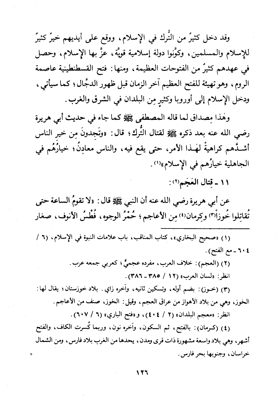 عن أبي هريرة رضي الله عنه أن النّبيّ - صلّى الله عليه وسلم - قال: "لا تقومُ السّاعة حتّى تُقاتِلوا خُوزًا (¬٣) وكِرمان (¬٤) مِن الأعاجم؛ حُمْرُ الوجوه، فُطْسُ الأنوف، صغار
