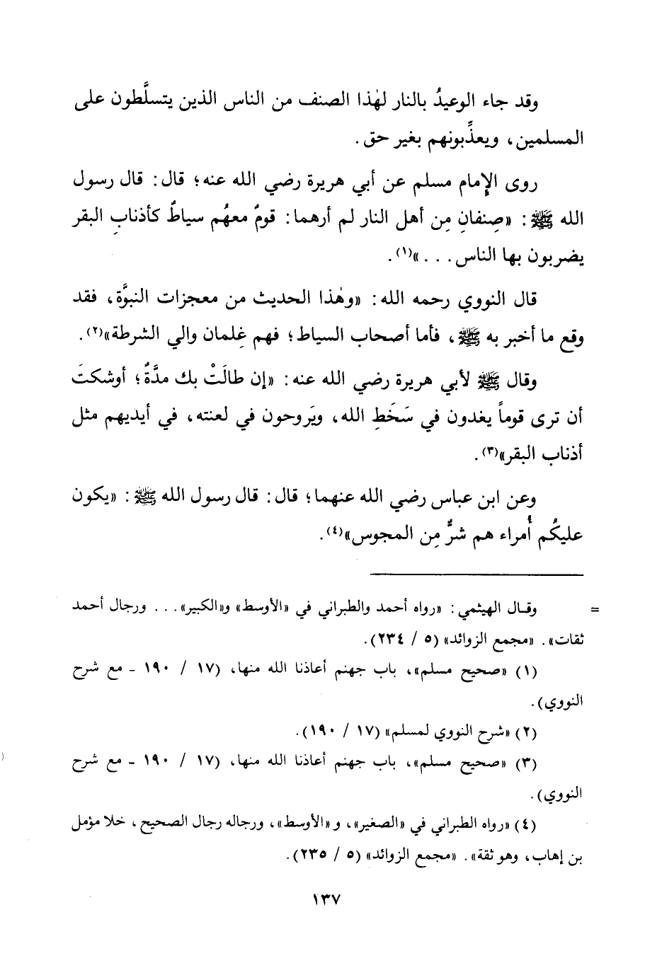 روى الإمام مسلم عن أبي هريرة رضي الله عنه؛ قال: قال رسول الله - صلّى الله عليه وسلم -: "صِنفانِ مِن أهل النّار لم أرهما: قومٌ معهُم سياطٌ كأذنابِ البقر يضربون بها النَّاس ... " (¬١).
