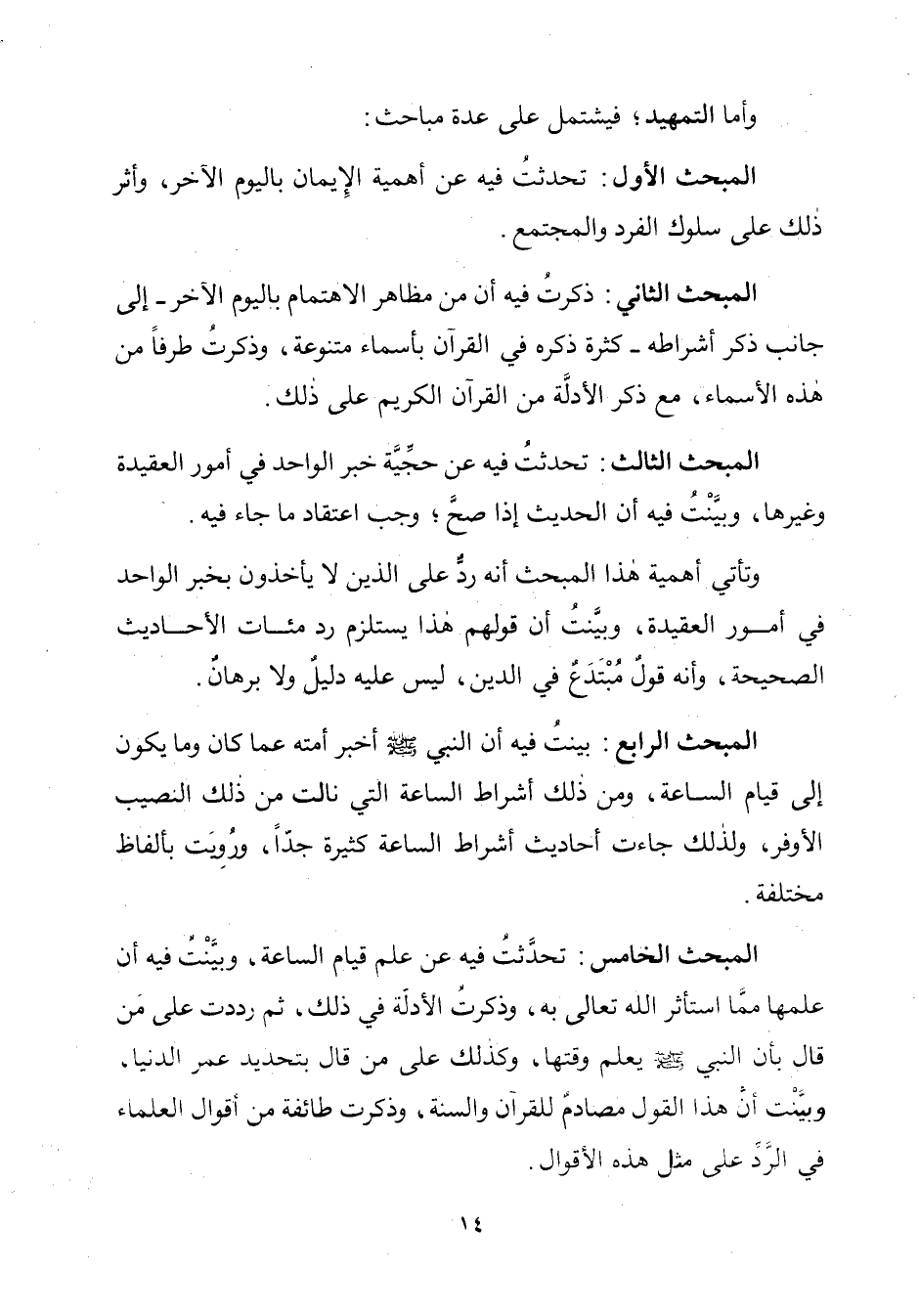 المبحث الخامس: تحدَّثتُ فيه عن علم قيام السّاعة، وبيَّنْتُ فيه أن علمها ممَّا استأثر الله تعالى به، وذكرتُ الأدلَّة في ذلك، ثمّ رددتُ على مَنْ قال بأن النّبيّ - صلّى الله عليه وسلم - يعلم وقتها، وكذلك على مَنْ قال بتحديد عمر الدنيا، وبيَّنْتُ أنَّ هذا القول مصادمٌ للقرآن والسُّنَّة، وذكرتُ طائفة من أقوال العلماء في الرَّدَّ على مثل هذه الأقوال.