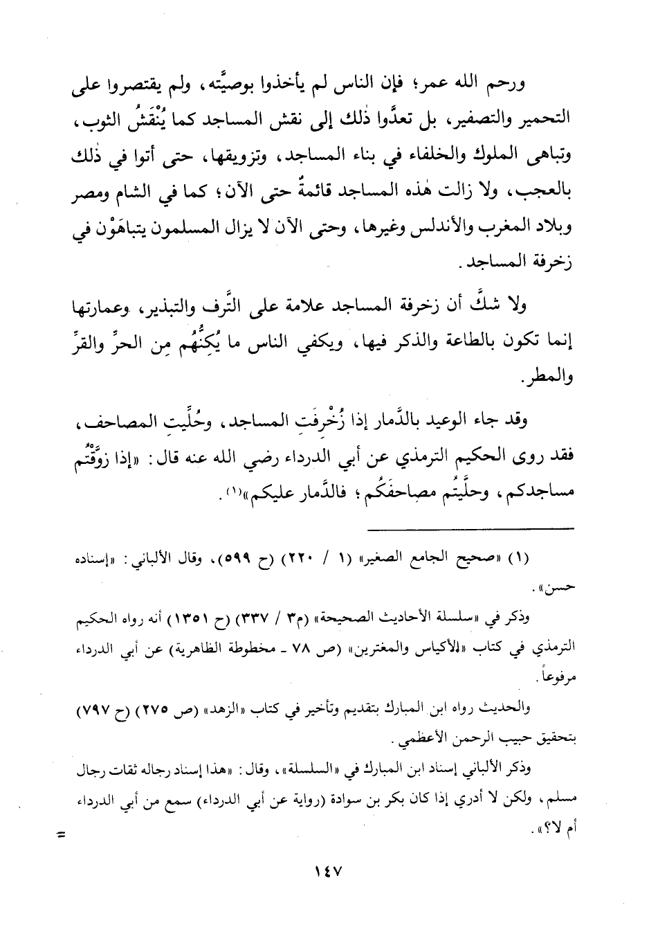 وقد جاء الوعيد بالدَّمار إذا زُخْرِفَتِ المساجد، وحُلِّيتِ المصاحف، فقد روى الحكيم التّرمذيّ عن أبي الدرداء رضي الله عنه قال: "إذا زَوَّقْتُم مساجدكم، وحلَّيتُم مصاحفَكُم؛ فالدَّمار عليكم" (¬١).