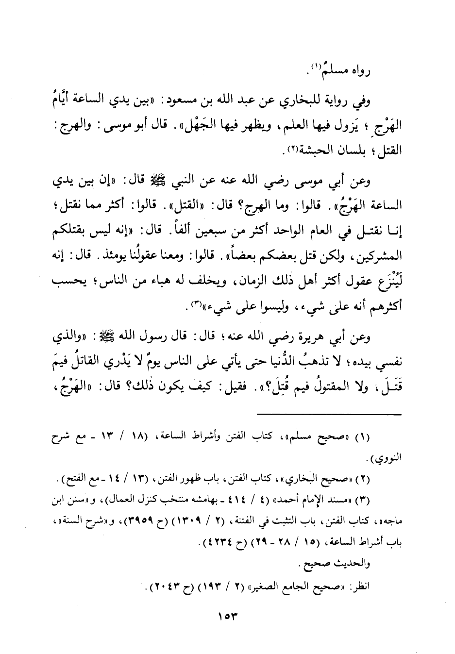 وعن أبي موسى رضي الله عنه عن النّبيّ كما قال: "إن بين يدي السّاعة الهَرْجُ". قالوا: وما الهرج؟ قال: "القتل". قالوا: أكثر ممّا نقتل؛ إنا نقتل في العام الواحد أكثر من سبعين ألفًا. قال: "إنّه ليس بقتلكم المشركين، ولكن قتل بعضكم بعضًا". قالوا: ومعنا عقولُنا يومئذ. قال: إنّه لَيُنْزَع عقول أكثر أهل ذلك الزّمان، ويخلف له هباء من النَّاس؛ يحسب أكثرهم أنّه على شيء، وليسوا على شيء" (¬٣).