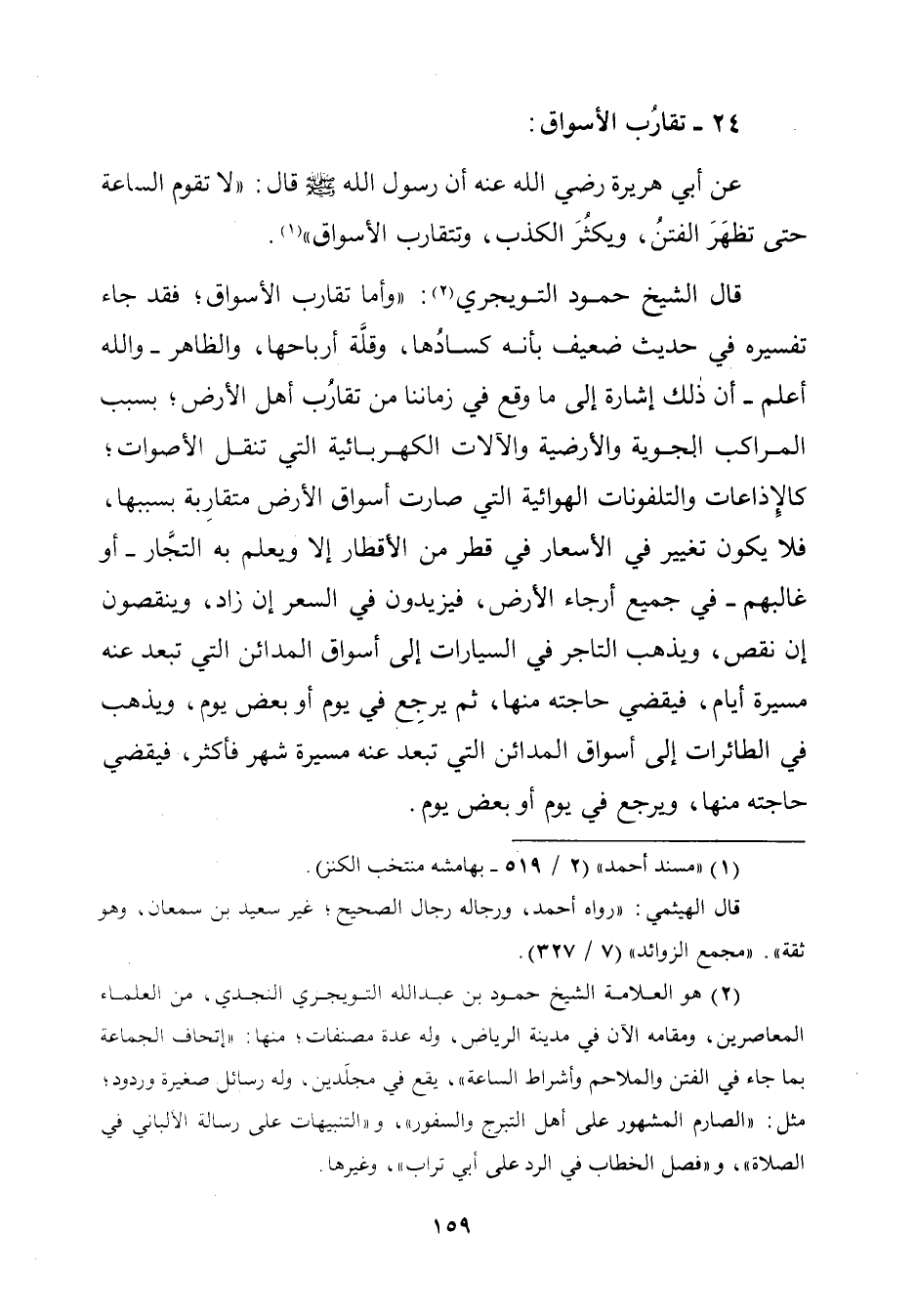 قال الشّيخ حمود التويجري (¬٢): "وأمّا تقارب الأسواق؛ فقد جاء تفسيره في حديث ضعيف بأنّه كسادُها، وقفَة أرباحها، والظاهر- والله أعلم- أن ذلك إشارة إلى ما وقع في زماننا من تقارُب أهل الأرض؛ بسبب المراكب الجوية والأرضية والآلات الكهربائية الّتي تنقل الأصوات؛ كالإِذاعات والتلفونات الهوائية الّتي صارت أسواق الأرض متقارِبة بسببها، فلا يكون تغيير في الأسعار في قطر من الأقطار إِلَّا ويعلم به التجَّار - أو غالبهم - في جميع أرجاء الأرض، فيزيدون في السعر إن زاد، وينقصون إن نقص، ويذهب التاجر في السيارات إلى أسواق المدائن الّتي تبعد عنه مسيرة أيّام، فيقضي حاجته منها، ثمّ يرجِع في يوم أو بعض يوم، ويذهب في الطائرات إلى أسواق المدائن الّتي تبعد عنه مسيرة شهر فأكثر، فيقضي حاجته منها، ويرجع في يوم أو بعض يوم.