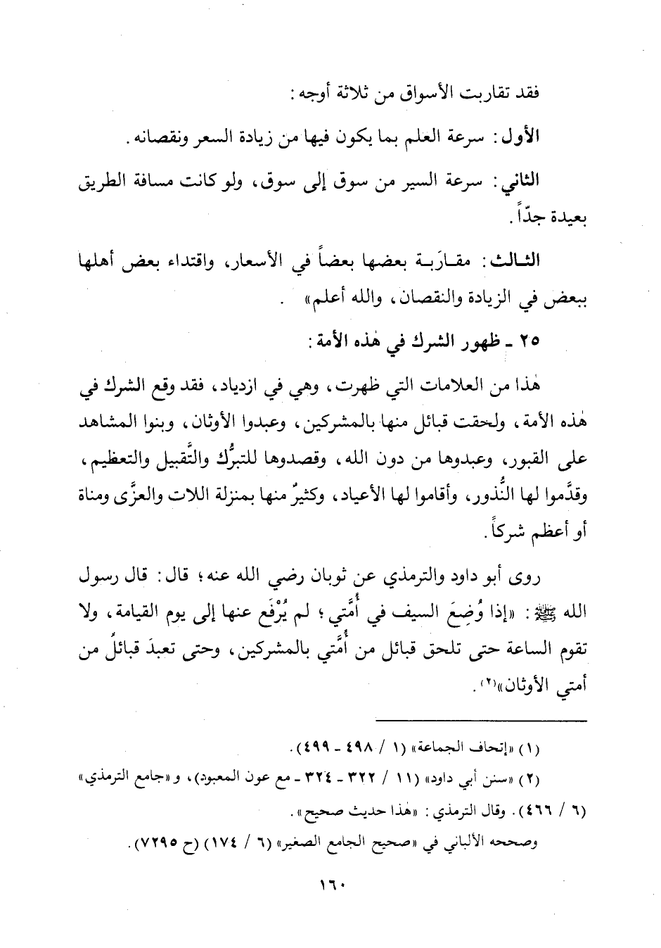 روى أبو داود والترمذي عيب ثوبان رضي الله عنه؛ قال: قال رسول الله - صلّى الله عليه وسلم -: "إذا وُضِعَ السيف في أُمَتي، لم يُرْفَع عنها إلى يوم القيامة، ولا تقوم السّاعة حتّى تلحق قبائل من أُمَّتي بالمشركين، وحتى تعبدَ قبائلُ من أمتي الأوثان" (¬٢).
