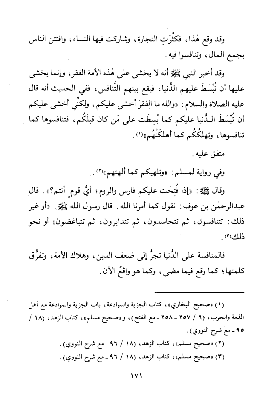 وقال - صلّى الله عليه وسلم -: "إذا فُتِحَت عليكم فارس والروم؛ أيُّ قومٍ أنتم؟ ". قال عبد الرّحمن بن عوف: نقول كما أمرنا الله. قال رسول الله - صلّى الله عليه وسلم -: "أو غير ذلك: تتنافسون، ثمّ تتحاسدون، ثمّ تتدابرون، ثمّ تتباغضون" أو نحو ذلك (¬٣).
