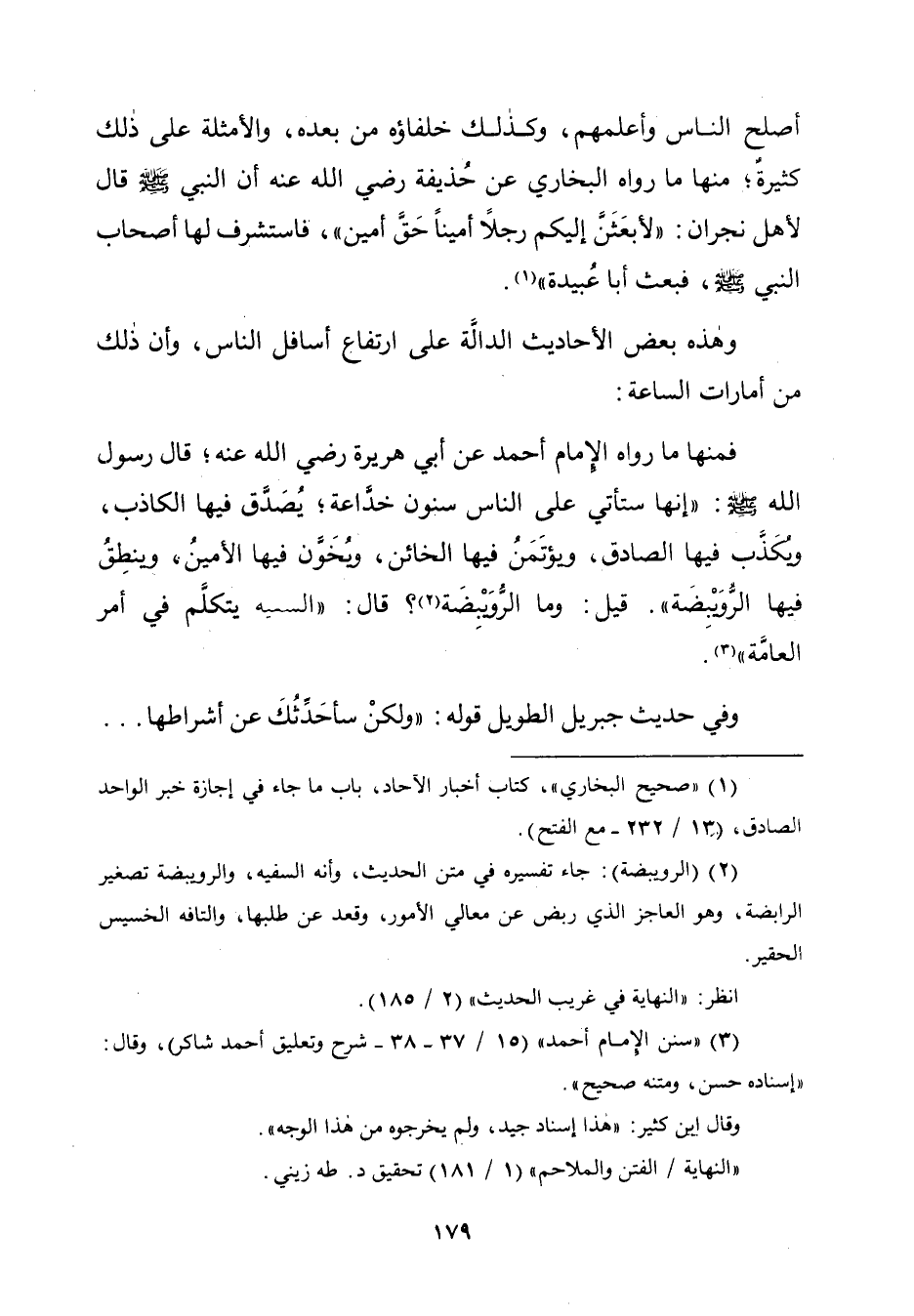فمنها ما رواه الإمام أحمد عن أبي هريرة رضي الله عنه؛ قال رسول الله - صلّى الله عليه وسلم -: "إنها ستأتي على النَّاس سنون خدَّاعة؛ يُصَدَّق فيها الكاذب، ويُكَذَّب فيها الصادق، ويؤتَمَنُ فيها الخائن، ويُخَوَّن فيها الأمينُ، وينطِقُ فيها الرُّوَيْبِضَة". قيل: وما الرُّوَيْبِضَة (¬٢)؟ قال: "السفيه يتكلَّم في أمر العامَّة" (¬٣).