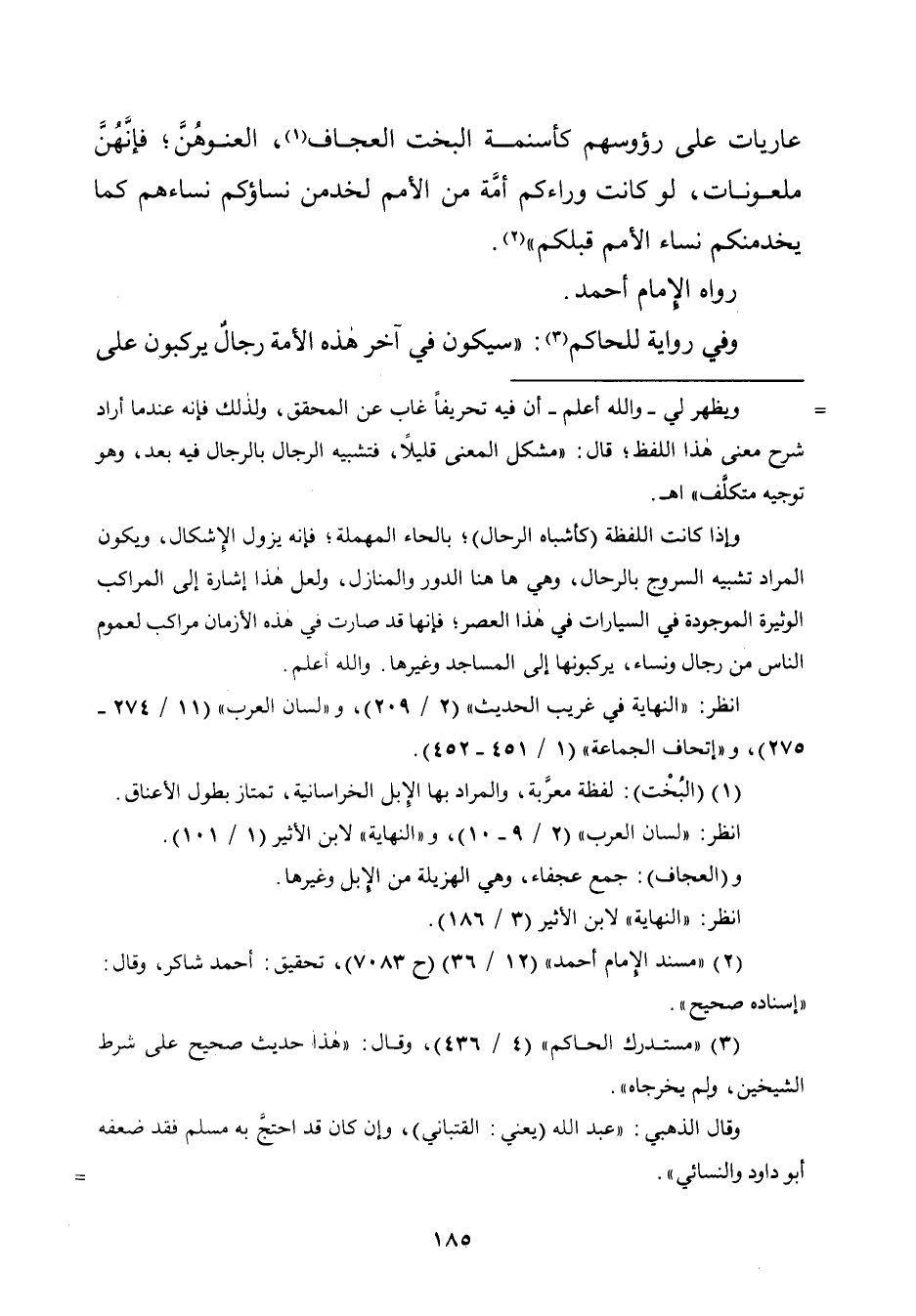 وإذا كانت اللفظة (كأشباه الرحال)؛ بالحاء المهملة، فإنّه يزول الإِشكال، ويكون المراد تشبيه السروج بالرحال، وهي هاهنا الدور والمنازل، ولعلّ هذا إشارة إلى المراكب الوثيرة الموجودة في السيارات فأنّهذا العصر؛ فإنها قد صارت في هذه الأزمان مراكب لعموم النَّاس من رجال ونساء، يركبونها إلى المساجد وغيرها. والله اعلم.