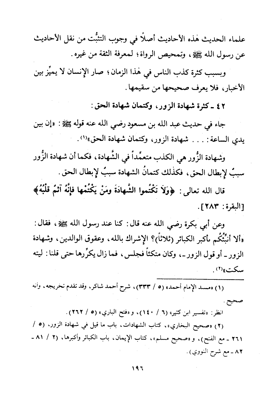 (¬٢) "صحيح البخاريّ"، كتاب الشهادات، باب ما قيل في شهادة الزور، (٥/ ٢٦١ - مع الفتح)، و "صحجح مسلم"، كتاب الإِيمان، باب الكبائر وأكبرها، (٢/ ٨١ - ٨٢ - مع شرط النووي).