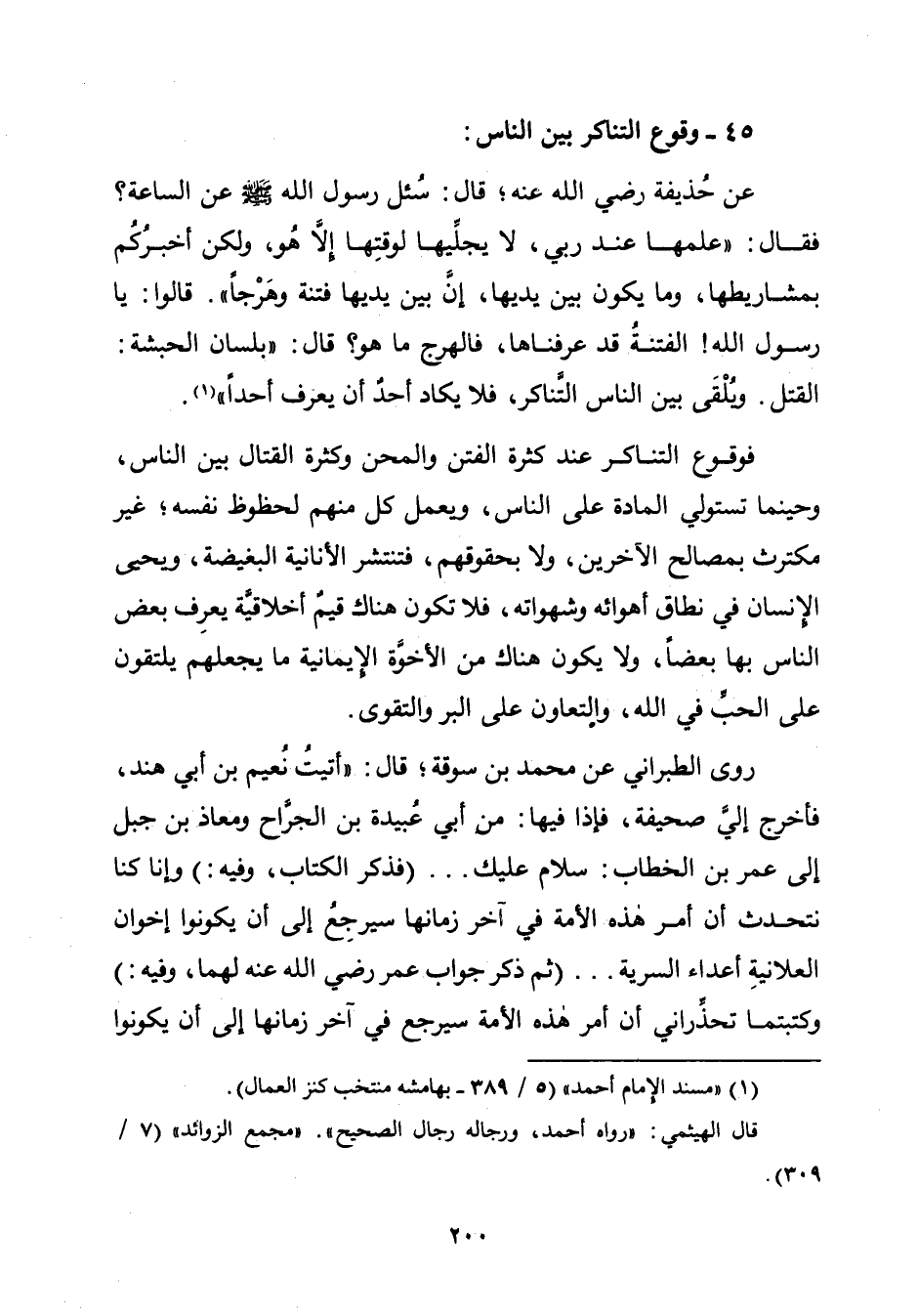 عن حُذيفة رضي الله عنه، قال: سُئل رسول الله - صلّى الله عليه وسلم - عن السّاعة؟ فقال: "علمها عند ربي، لا يجلِّيها لوقتِها إِلًّا هُو، ولكن أخبرُكُم بمشاريطها، وما يكون بين يديها، إن بين يديها فتنة وهَرْجًا". قالوا: يا رسول الله! الفتنةُ قد عرفناها، فالهرج ما هو؟ قال: "بلسان الحبشة: القتل. ويُلْقَى بين النَّاس التَّناكر، فلا يكاد أحدٌ أن يعرف أحدًا" (¬١).