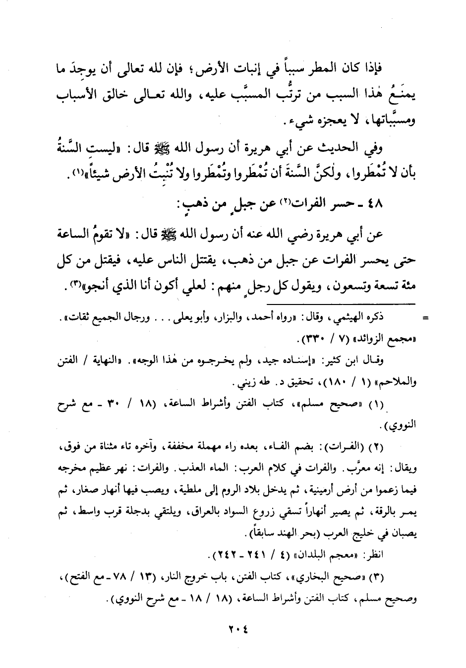 عن أبي هريرة رضي الله عنه أن رسول الله - صلّى الله عليه وسلم - قال: "لا تقومُ السّاعة حتّى يحسر الفرات عن جبل من ذهب، يقتتل النَّاس عليه، فيقتل من كلّ مئة تسعة وتسعون، ويقول كلّ رجلٍ منهم: لعلّي أكون أنا الّذي أنجو" (¬٣).