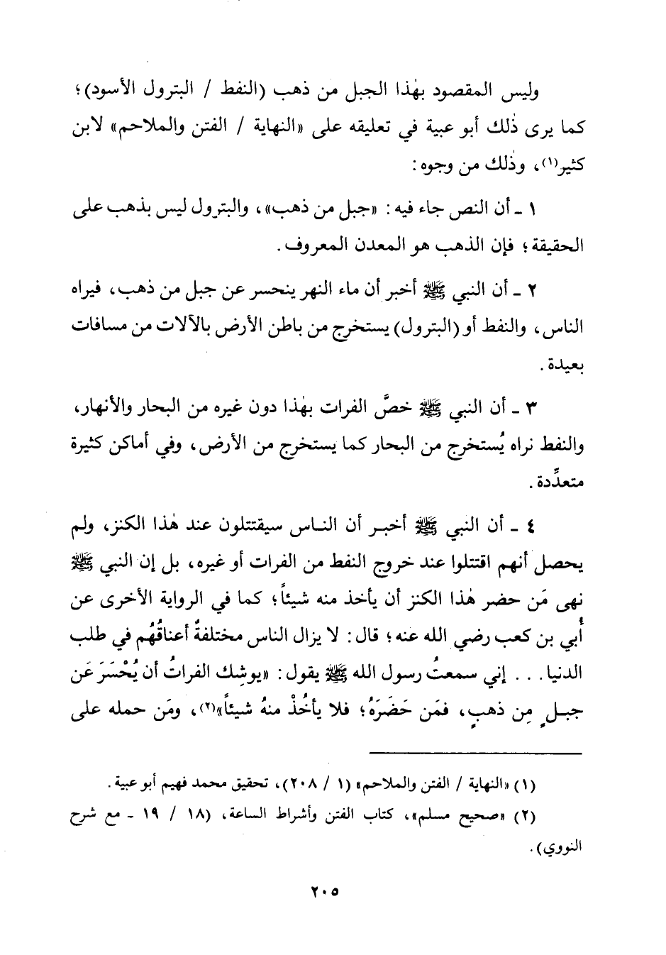٣ - أن النّبيّ - صلّى الله عليه وسلم - خصَّ الفرات بهذا دون غيره من البحار والأنّهار، والنفط نراه يُستخرج من البحار كما يستخرج من الأرض، وفي أماكن كثيرة متعدِّدة.