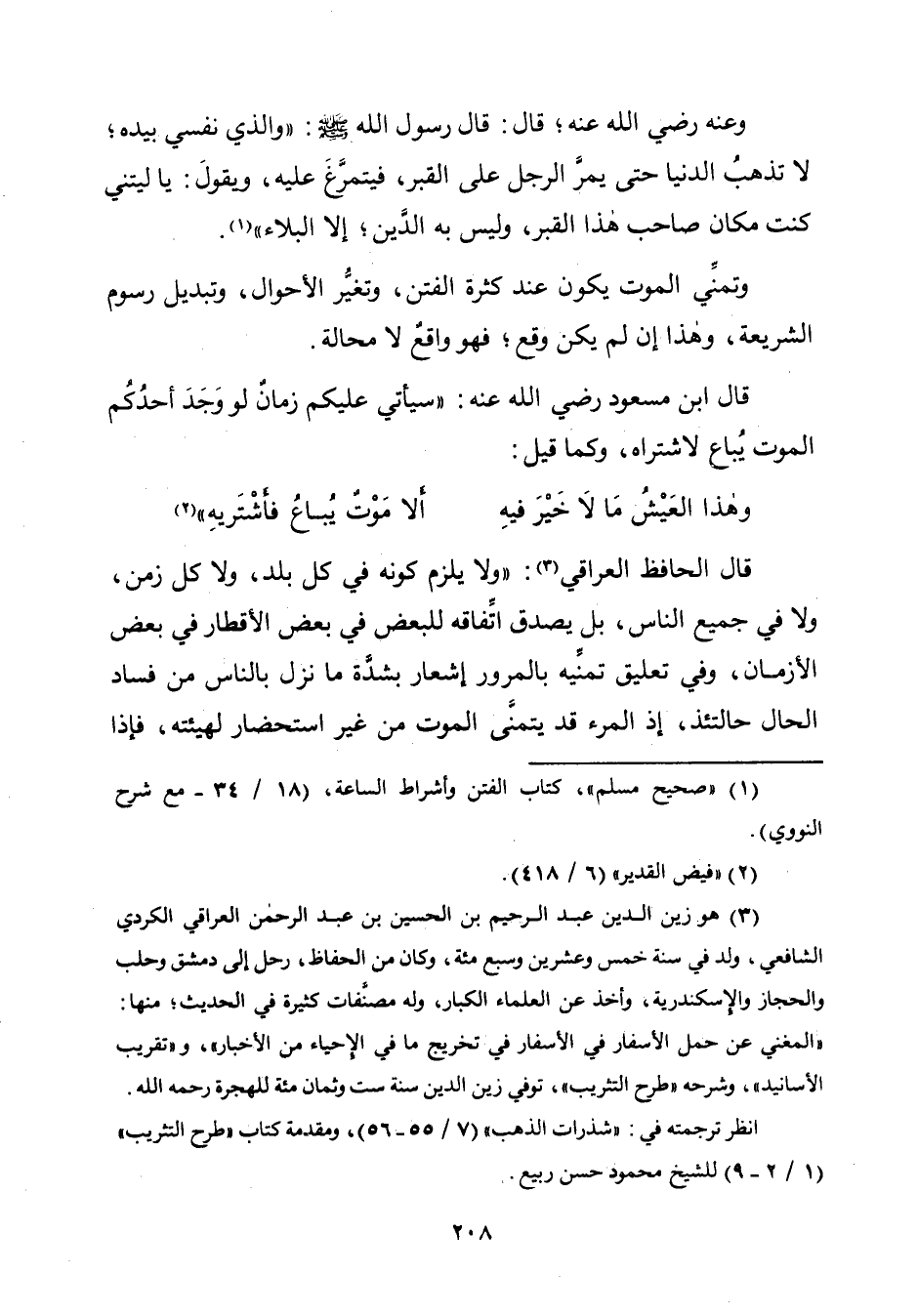 قال الحافظ العراقي (¬٣): "ولا يلزم كونه في كلّ بلد، ولا كلّ زمن، ولا في جميع النَّاس، بل يصدق اتِّفاقه للبعض في بعض الأقطار في بعض الأزمان، وفي تعليق تمنِّيه بالمرور إشعار بشدَّة ما نزل بالناس من فساد الحال حالتئذ، إذ المرء قد يتمنَّى الموت من غير استحضار لهيئته، فإذا