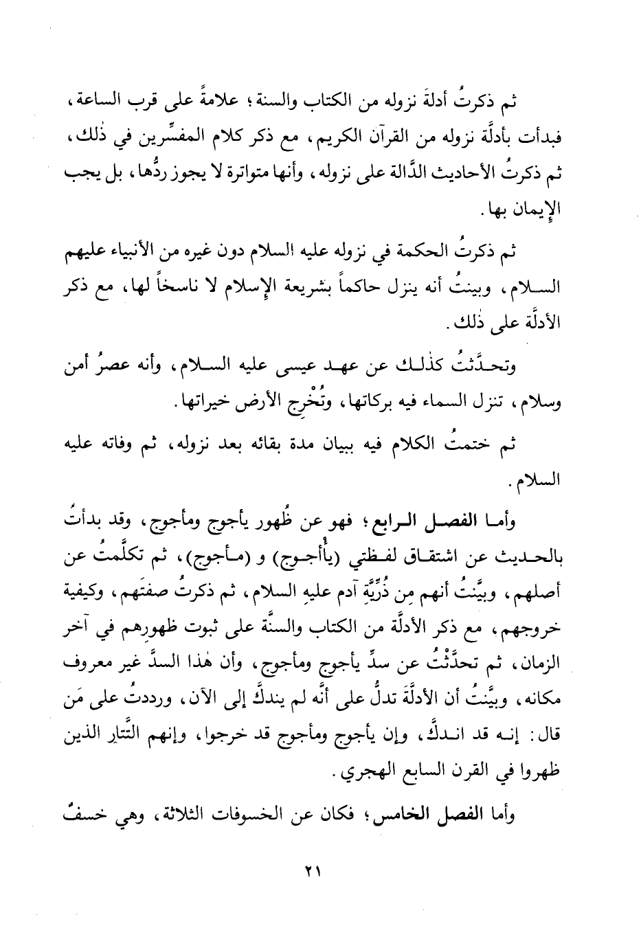 ثمّ ختمتُ الكلام فيه ببيان مدة. بقائه بعد نزوله، ثمّ وفاته عليه السّلام. وأمّا الفصل الرّابع؛ فهو عن ظُهور يأجوج ومأجوج، وقد بدأتُ بالحديث عن اشتقاق لفظتي (يأْأجوج) و (مأجوج)، ثمّ تكلَّمتُ عن أصلهم، وبيَّنتُ أنّهم مِن ذُرَّيَّةِ آدم عليهِ السّلام، ثمّ ذكرتُ صفتَهم، وكيفية خروجهم، مع ذكر الأدلَّة من الكتاب والسنَة على ثبوت ظهورِهم في آخر الزّمان، ثمّ تحدَّثْتُ عن سدِّ يأجوج ومأجوج، وأن هذا السدَّ غير معروف مكانه، وبيَّنتُ أن الأدلَّةَ تدلُّ على أنَّه لم يندكَّ إلى الأن، ورددتُ على مَنْ قال؛ إنّه قد اندكَّ، وإن يأجوج ومأجوج قد خرجوا، وإنهم التَّتار الذين ظهروا في القرن السابع الهجري.