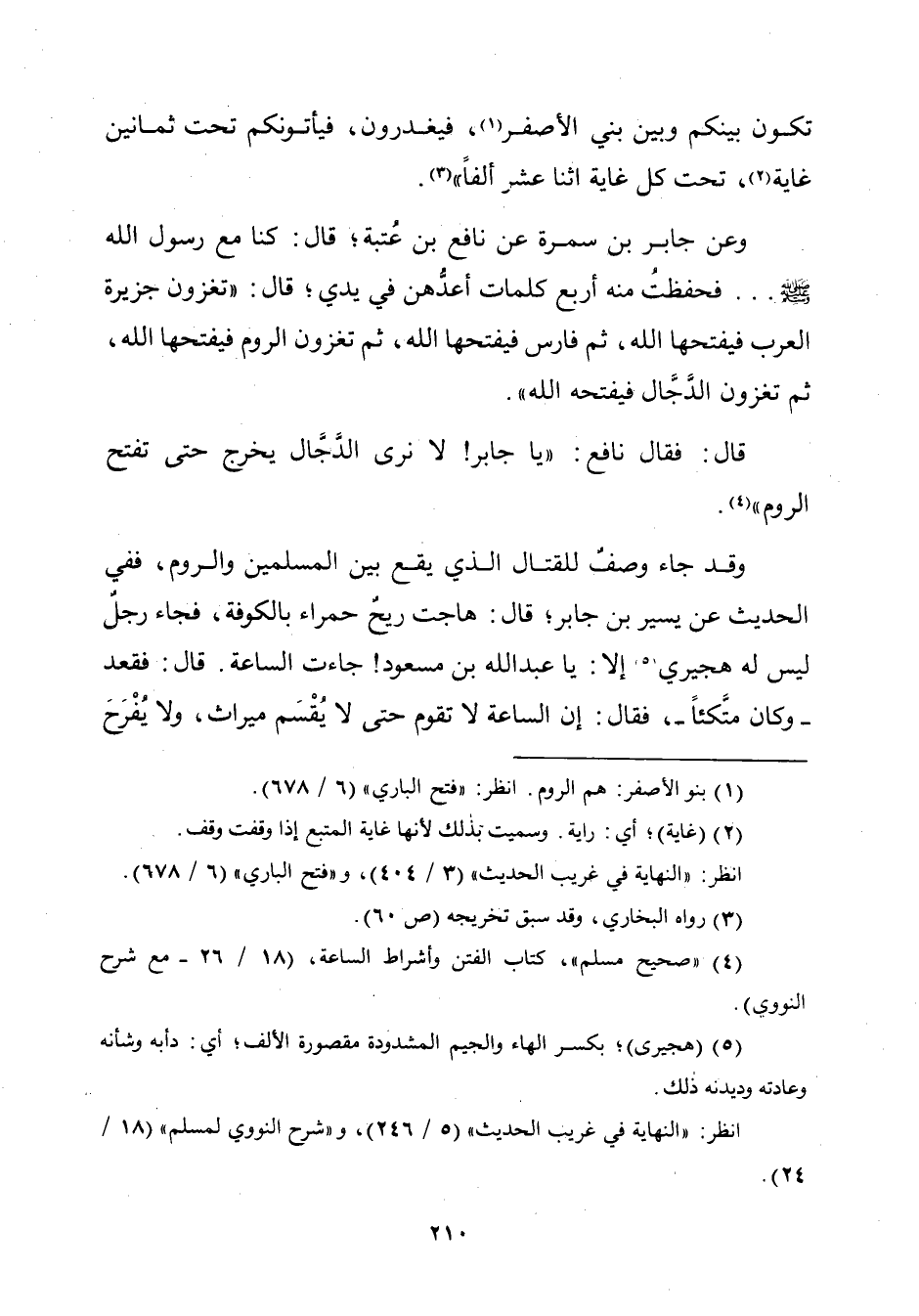 وعن جابر بن سمرة عن نافع بن عُتبة؛ قال: كنا مع رسوك الله - صلّى الله عليه وسلم - ... فحفظتُ منه أربع كلمات أعدُّهن في يدي؛ قال: "تغزون جزيرة العرب فيفتحها الله، ثمّ فارس فيفتحها الله، ثمّ تغزون الروم فيفتحها الله، ثمّ تغزون الدَّجَّال فيفتحه الله".