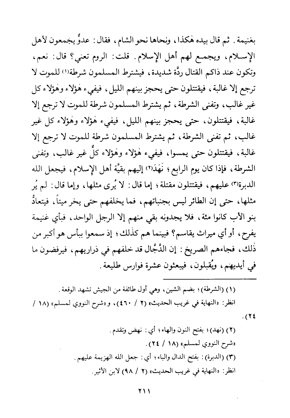 بغنيمة. ثمّ قال بيده لهكذا، ونحاها نحو الشّام، فقال: عدوٌّ يجمعون لأهل الإِسلام، ويجمع لهم أهل الإِسلام. قلت: الروم تعني؟ قال: نعم، وتكون عند ذاكم القتال ردَّة شديدة، فيشترط المسلمون شرطة (¬١) للموت لا ترجع إِلَّا غالبة، فيقتتلون حتّى يحجز بينهم اللّيل، فيفيء هؤلاء وهؤلاء كلّ غير غالب، وتفنى الشرطة، ثمّ يشترط المسلمون شرطة للموت لا ترجع إِلَّا غالبة، فيقتتلون، حتّى يحجز بينهم اللّيل، فيفيء هؤلاء ولهؤلاء كلّ غير غالب، ثمّ تفنى الشرطة، ثمّ يشترط المسلمون شرطة للموت لاترجع إِلَّا غالبة، فيقتتلون حتّى يمسوا، فيفيء لهؤلاء وهؤلاء كلٌّ غير غالب، وتفنى الشرطة، فإذا كان يوم الرّابع؛ نَهَدَ (¬٢) إليهم بقيَّة أهل الإِسلام، فيجعل الله الدبرة (¬٣) عليهم، فيقتتلون مقتلة؛ إمّا قال: لا يُرى مثلها، وإما قال: لم يُر مثلها، حتّى إن الطائر ليس بجنباتهم، فما يخلفهم حتّى يخر ميتًا، فيتعادُّ بنو الأب كانوا مئة، فلا يجدونه بقي منهم إِلَّا الرَّجل الواحد، فبأي غنيمة يفرح، أو أي ميراث يقاسم؟ فبينما هم كذلك؛ إذ سمعوا ببأس هو أكبر من ذلك، فجاءهم الصريخ: إن الدَّجَّال قد خلفهم في ذراريهم، فيرفضون ما في أيديهم، ويُقبلون، فيبعثون عشرة فوارس طليعة.