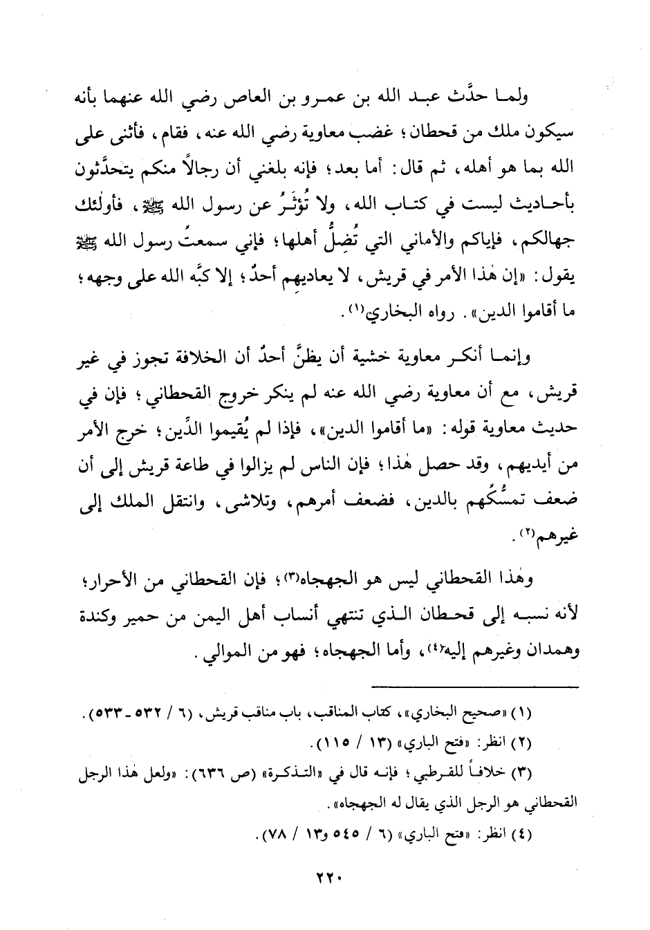 ولما حدَّث عبد الله بن عمرو بن العاص رضي الله عنهما بأنّه سيكون ملك من قحطان؛ غضب معاوية رضي الله عنه، فقام، فأثنى على الله بما هو أهله، ثمّ قال: أمّا بعد؛ فإنّه بلغني أن رجالًا منكم يتحدَّثون بأحاديث ليست في كتاب الله، ولا تُؤثَرُ عن رسول الله - صلّى الله عليه وسلم -، فأولئك جهالكم، فإياكم والأماني الّتي تُضِلُّ أهلها؛ فإني سمعت رسول الله - صلّى الله عليه وسلم - يقول: "إن لهذا الأمر في قريش، لا يعاديهِم أحدٌ؛ إِلَّا كبَّه الله على وجهه؛ ما أقاموا الدين". رواه البخاريّ (¬١).