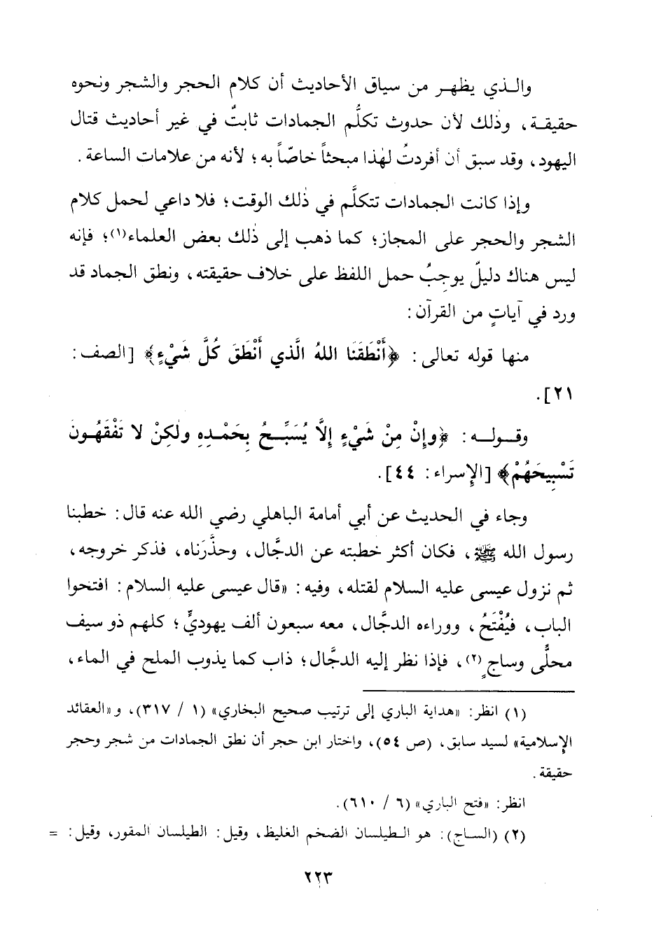 (¬١) انظر: "هداية الباري إلى ترتيب صحيح البخاريّ" (١/ ٣١٧)، و"العقائد الإِسلامية" لسيد سابق، (ص ٥٤)، واختار ابن حجر أن نطق الجمادات من شجر وحجر حقيقة.