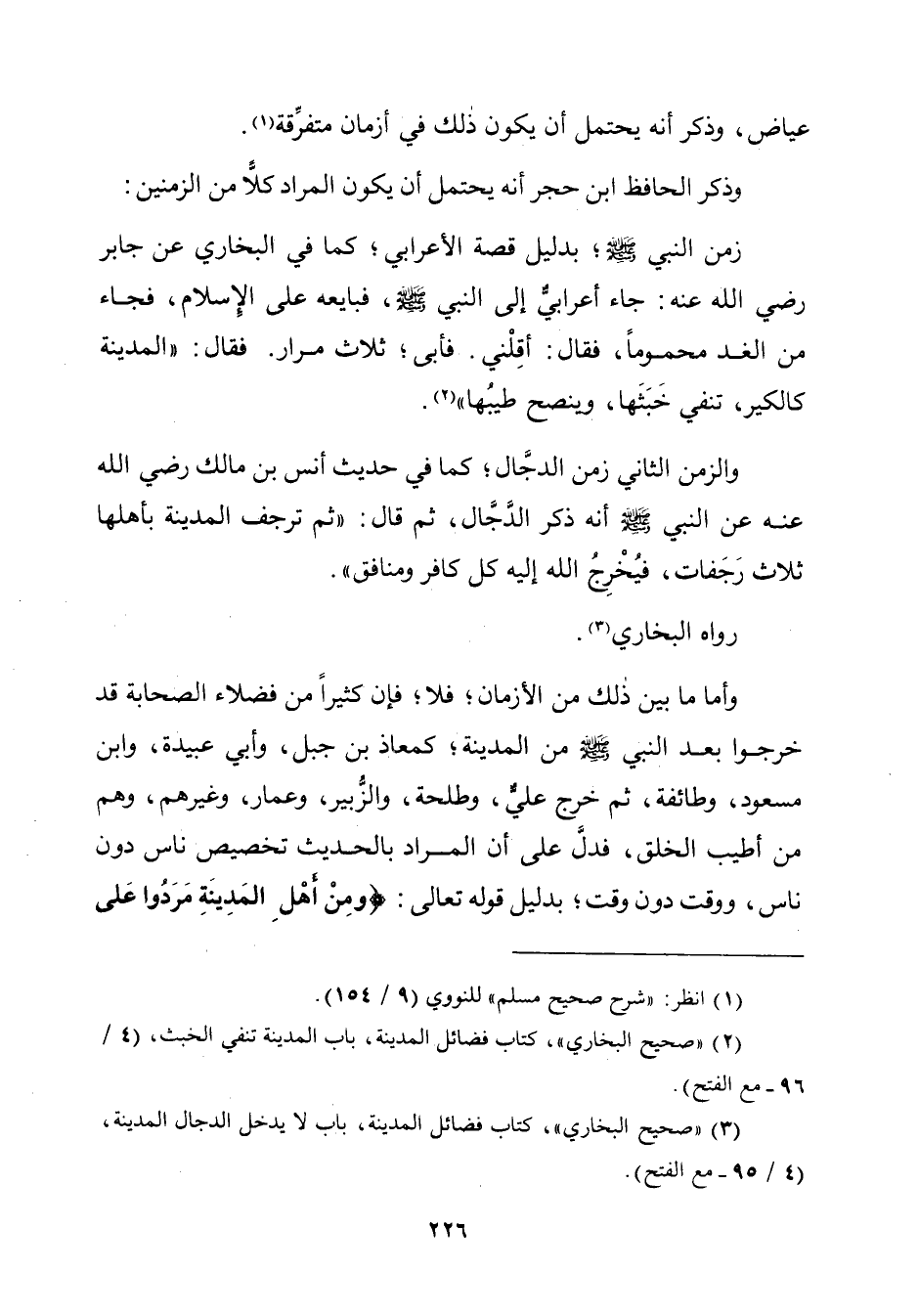 وأمّا ما بين ذلك من الأزمان؛ فلا؛ فإن كثيرًا من فضلاء الصّحابة قد خرجوا بعد النّبيّ - صلّى الله عليه وسلم - من المدينة؛ كمعاذ بن جبل، وأبي عبيدة، وابن مسعود، وطائفة، ثمّ خرج عليٌّ، وطلحة، والزُّبير، وعمار، وغيرهم، وهم من أطيب الخلق، فدلَّ على أن المراد بالحديث تخصيص ناس دون ناس، ووقت دون وقت؛ بدليل قوله تعالى: {وَمِنْ أَهْلِ الْمَدِينَةِ مَرَدُوا عَلَى