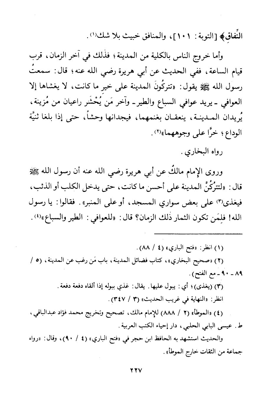 وروى الإِمام مالكٌ عن أبي هريرة رضي الله عنه أن رسول الله - صلّى الله عليه وسلم - قال: "لتترُكُنَّ المدينة على أحسن ما كانت، حتّى يدخل الكلب أو الذئب، فيغذى (¬٣) على بعض سواري المسجد، أو على المنبر". فقالوا: يا رسول الله! فلِمَن تكون الثمار ذلك الزّمان؟ قال: "للعوافي: الطير والسباع" (¬٤).