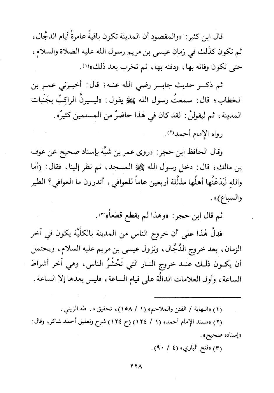 قال ابن كثير: "والمقصود أن المدينة تكون باقيةً عامرةً أيّام الدجَّال، ثمّ تكون كذلك في زمان عيسى بن مريم رسول الله عليه الصّلاة والسلام، حتّى تكون وفاته بها، ودفنه بها، ثمّ تخرب بعد ذلك" (¬١).