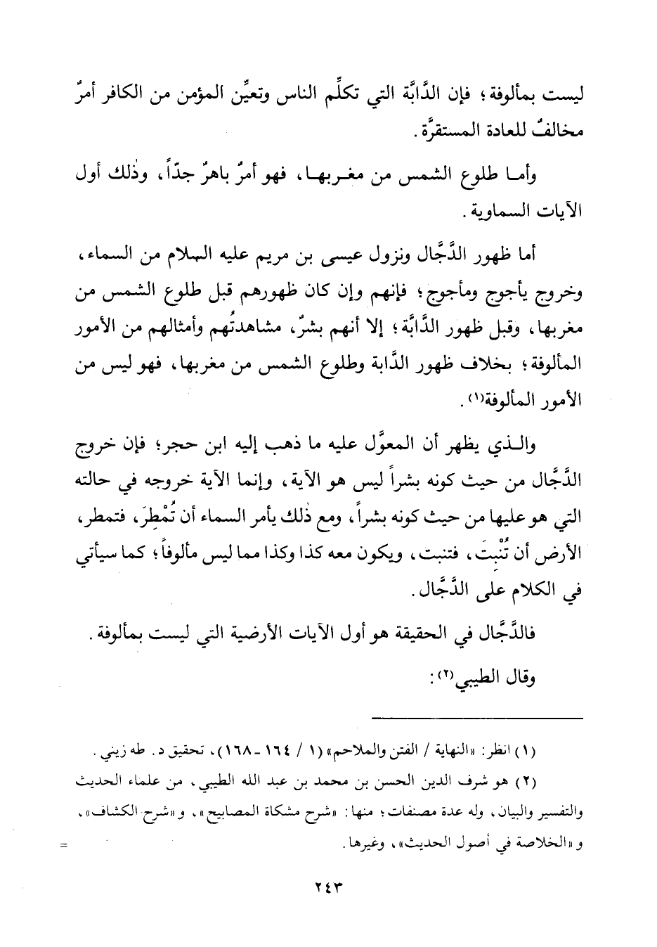 والذي يظهر أن المعوَّل عليه ما ذهب إليه ابن حجر؛ فإن خروج الدَّجَّال من حيث كونه بشرًا ليس هو الآية، وإنّما الآية خروجه في حالته الّتي هو عليها من حيث كونه بشرًا، ومع ذلك يأمر السَّماء أن تُمْطِرَ، فتمطر، الأرض أن تُنْبتَ، فتنبت، ويكون معه كذا وكذا ممّا ليس مألوفًا؛ كما سيأتي في الكلام عَلى الدَّجَّال.