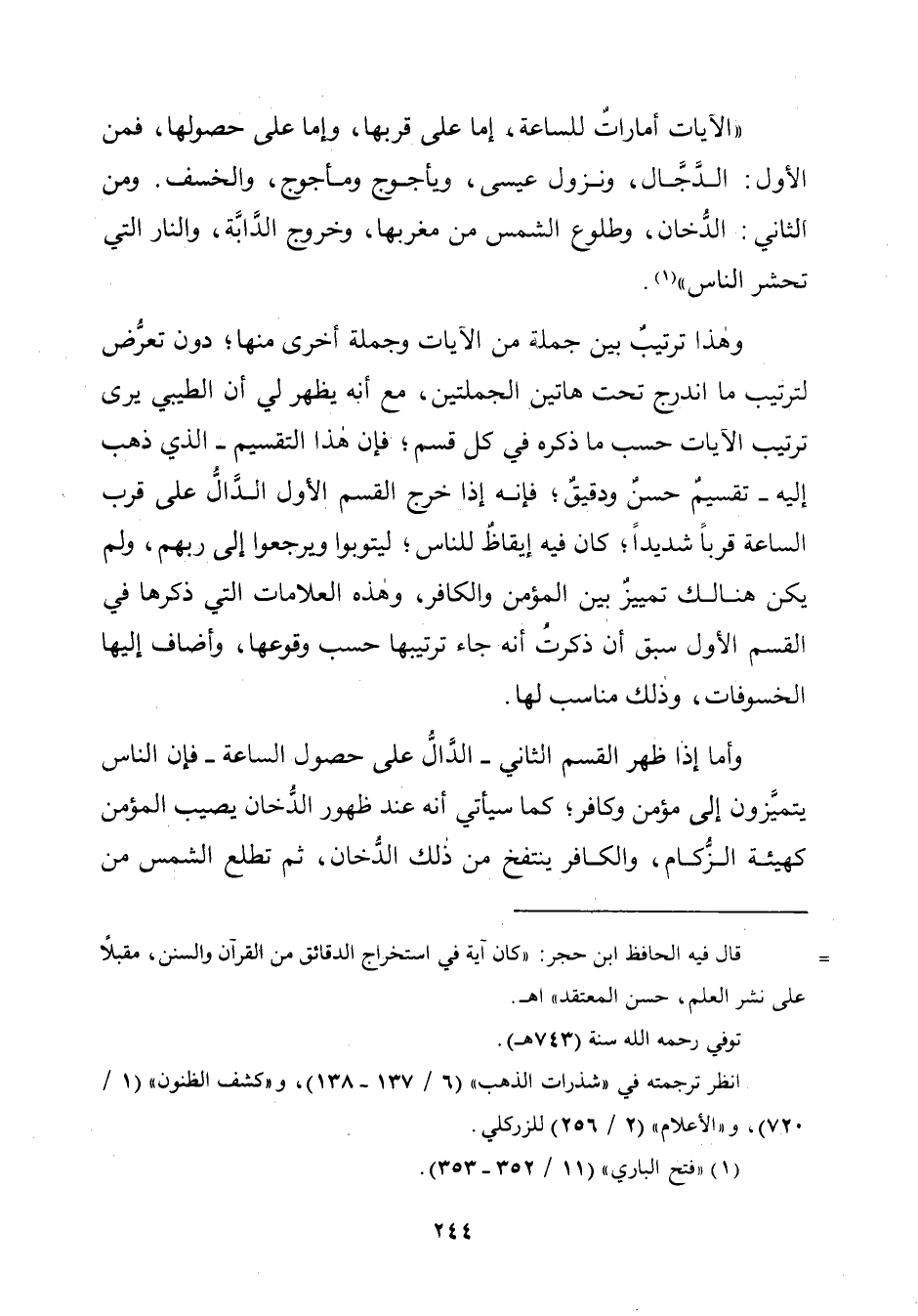 "الآيات أماراتٌ للساعة، إمّا على قربها، وإما على حصولها، فمن الأوّل: الدَّجَّال، ونزول عيسى، ويأجوج ومأجوج، والخسف. ومن الثّاني: الدُّخان، وطلوع الشّمس من مغربها، وخروج الدَّابَّة، والنار الّتي تحشر النَّاس" (¬١).