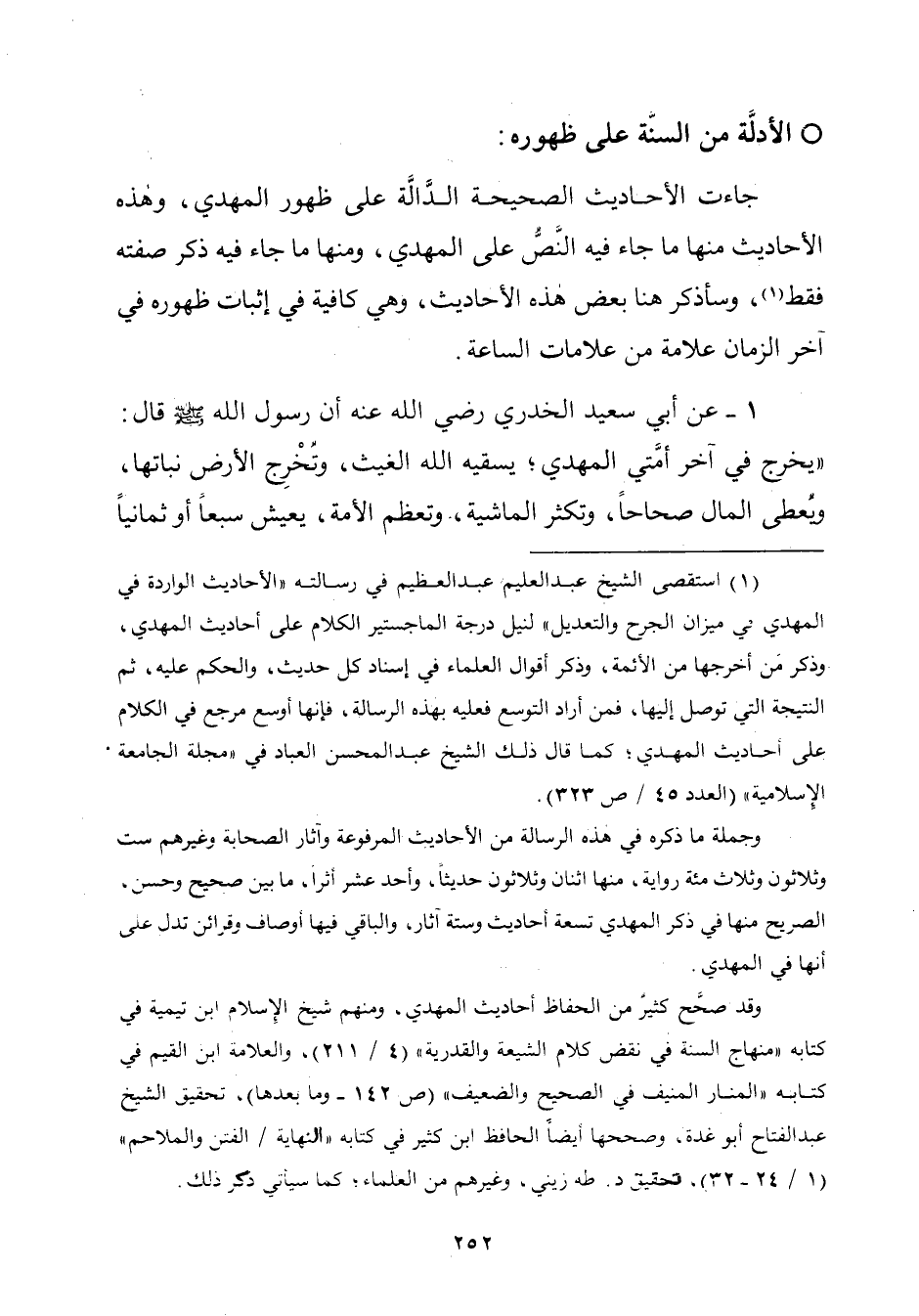 (¬١) استقصى الشّيخ عبد العلّيم عبد العظيم في رسالته "الأحاديث الواردة في المهدي في ميزان "الجرح والتعديل" لنيل درجة الماجستير الكلام على أحاديث المهدي، وذكر مَنْ أخرجها من الأئمة، وذكر أقوال العلماء في إسناد كلّ حديث، والحكم عليه، ثمَّ النتيجة الّتي توصل إليها، فمن أراد التوسع فعليه بهذه الرسالة، فإنها أوسع مرجع في الكلام على أحاديث المهدي؛ كما قال ذلك الشّيخ عبد المحسن العباد في "مجلة الجامعة الإِسلامية" (العدد ٤٥/ ص ٣٢٣).