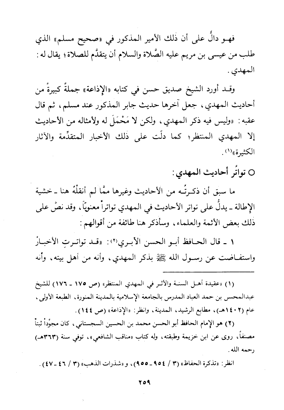(¬١) "عقيدة أهل السنة والأثر في المهدي المنتظر" (ص ١٧٥ - ١٧٦) للشيخ عبد المحسن بن حمد العباد المدرس بالجامعة الإسلامية بالمدينة المنورة، الطبعة الأولى، عام (١٤٠٢ هـ)، مطابع الرشيد، المدينة، وانظر: "الإذاعة" (ص ١٤٤).