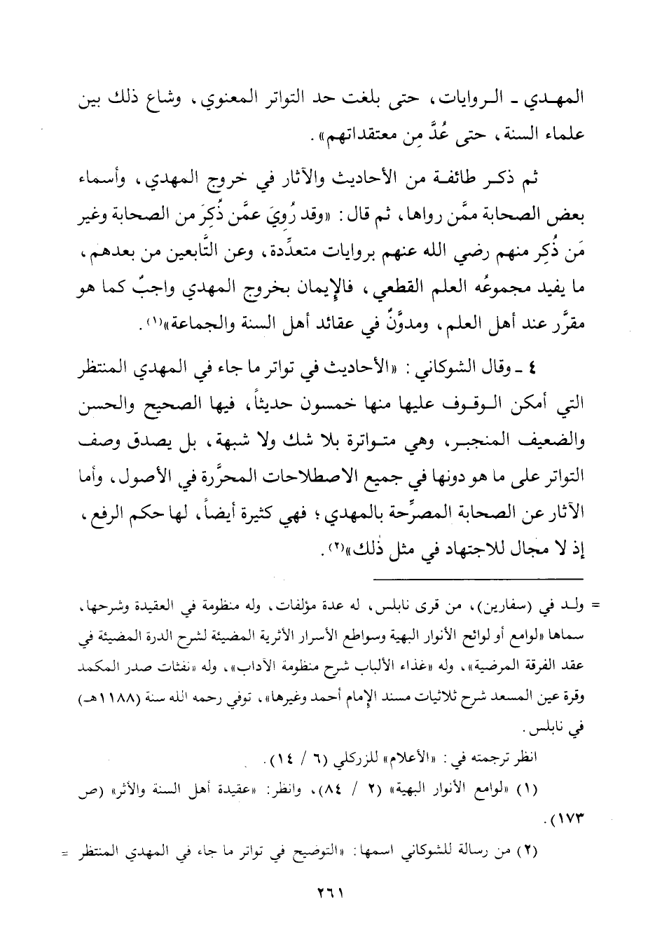 ثمَّ ذكر طائفة من الأحاديث والآثار في خروج المهدي، وأسماء بعض الصّحابة ممَّن رواها، ثمَّ قال: "وقد رُوِيَ عمَّن دكِرَ من الصّحابة وغير مَنْ ذُكِر منهم رضي الله عنهم بروايات متعدِّدة، وعن التَّابعين من بعدهم، ما يفيد مجموعُه العلم القطعي، فالإِيمان بخروج المهدي واجبٌ كما هو مقرر عند أهل العلم، ومدوَّنٌ في عقائد أهل السنة والجماعة" (¬١).