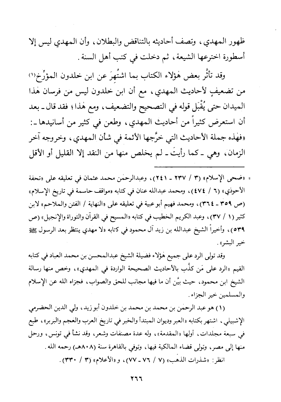 وقد تأثَّر بعض هؤلاء الكتاب بما اشتُهِرَ عن ابن خلدون المؤرِّخ (¬١) من تضعيفٍ لأحاديث المهدي، مع أن ابن خلدون ليس من فرسان هذا الميدان حتّى يُقْبَل قوله في التصحيح والتضعيف، ومع هذا؛ فقد قال -بعد أن استعرض كثيرًا من أحاديث المهدي، وطعن في كثير من أسانيدها-: "فهذه جملة الأحاديث الّتي خرَّجها الأئمة في شأن المهدي، وخروجه آخر الزّمان، وهي -كما رأيتَ- لم يخلص منها من النقد إِلَّا القليل أو الأقل